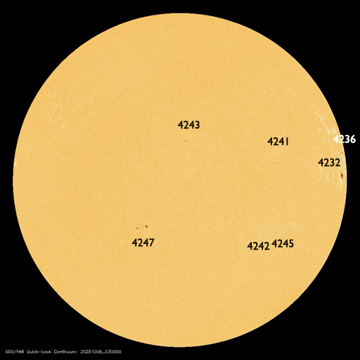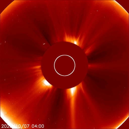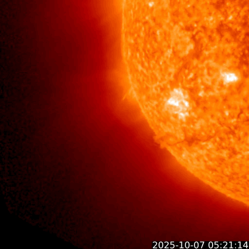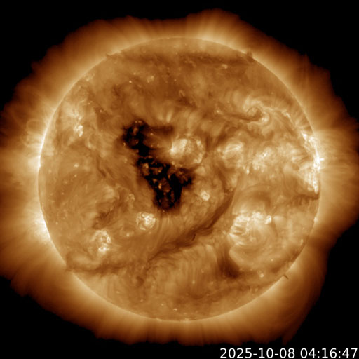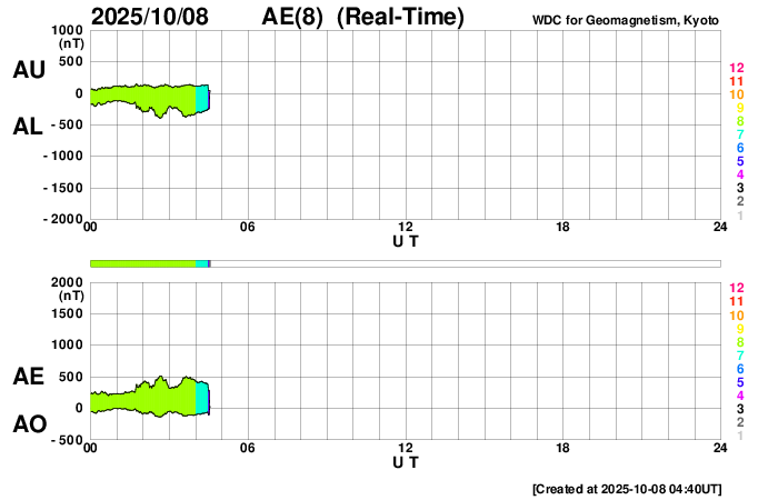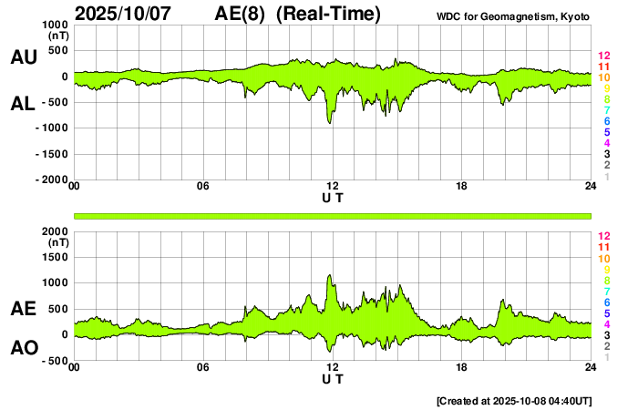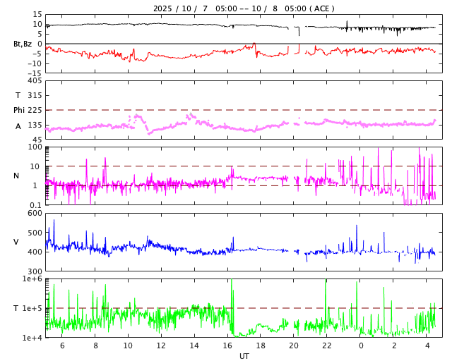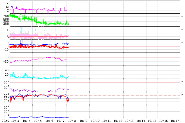2025/10/ 8 13:46 更新 太陽風は平均的な状態です。磁場が南向きになり、磁気圏の活動が強まりました。 担当 篠原 太陽風の速度は、400km/秒と平均的な状態で推移しています。 磁場強度は、グラフの前半は10nTに強まっていましたが、 後半は8nTに少し下がっています。 磁場の南北成分は、南向きの状態が続いていて、 グラフの前半は-5nT前後の状態が続き、 最後は少し小さくなって、-3nTになっています。 この影響で磁気圏の活動も強まって、 AE指数では、1000nTに強まる大きい変化も発生しています。 グラフの後半は、500nTくらいの中規模の変化です。 GOES衛星SUVI 195では、 コロナホールが太陽の中心線に達しています。 3日後くらいから影響が始まりそうです。 27日周期の図を見ると、 前周期は700km/秒を超える高速太陽風が来ましたが、 今回はどうなるでしょうか。 太陽は、7日15時(世界時7日6時)頃に、 南東側(左下)でフィラメント噴出が発生しています。 GOES衛星SUVI 304の動画を掲載します。 この噴出により、CME(コロナ質量放出)が太陽の左下に広がっています。 横向きの噴出なので、地球への影響はありません。 また、今朝、8日5時(世界時7日20時)に、 北西の端近く(右上)で、C9.1の小規模フレアが発生しました。