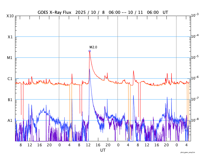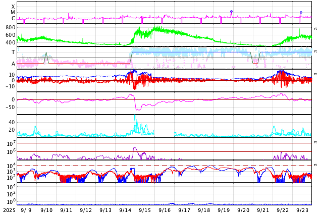 GOES衛星の太陽X線強度。赤・橙 = 0.1〜0.8 nm、青・紫 = 0.05〜0.4 nm (c) データ:NOAA/SWPC、作図:宇宙天気ニュース ![]() | ||||||||||||||||||||||||||||||||||||||||||||||||||||||||||||||||||||||||||||||||||||||||||||||||||||||||||||||||||||||||||||||||||||||||||||||||||||||||||||||||||||||||||||||||||||||||||||||||||||||||||||||||||||||||||||||||||||||