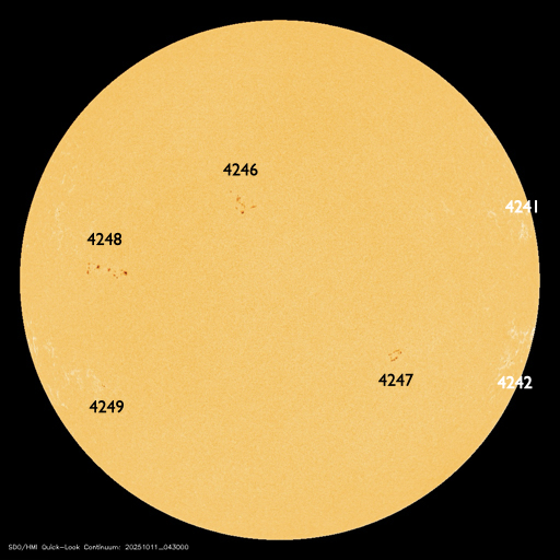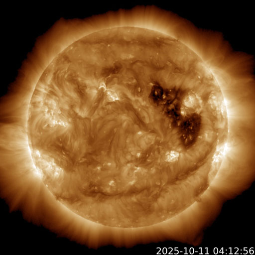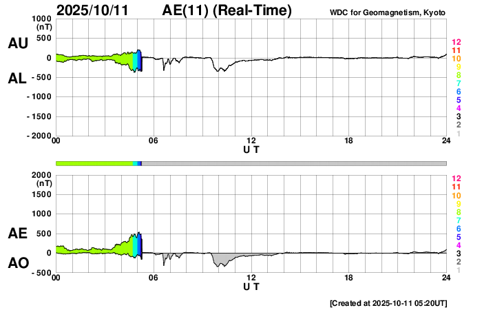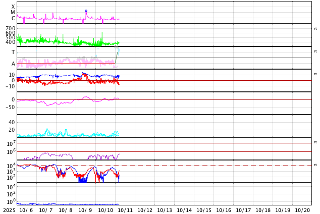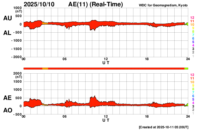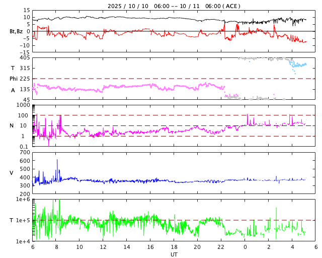2025/10/11 14:23 更新 太陽風は370km/秒とやや低速です。コロナホールの影響が近付いています。 担当 篠原 太陽風は、370km/秒とやや低速の状態で推移しています。 磁場強度は、8〜10nTと少し強まった値が続いています。 磁場の南北成分は、弱い南寄りが続いています。 AE指数は、300〜500nTの小規模の変化が時々発生しています。 GOES衛星SUVI 195では、コロナホールが北西側に進んでいます。 この領域の影響がそろそろ始まりそうです。 27日周期の図で前周期と比較すると、 コロナホールの東西(横方向)の広がりは小さくなっています。 高速太陽風の継続時間は前周期よりも短くなる可能性があります。 太陽は、北西(右上)の4241黒点群で C2.3の小規模フレアが発生した程度で、 穏やかな状態です。 ![]() GOES衛星SUVI 195カメラによる太陽コロナの様子 (c) GOES衛星SUVI 195 (NOAA) ![]() SDO衛星による太陽の可視光写真。SOHO衛星のWebページより取得しました。 (c) SDO (NASA) ![]() ACEが観測した太陽風の磁場(黒線は全体の強度、赤線は南北成分) 磁場の向き、プラズマの密度、速度、温度 (c) データ:NOAA/SWPC、作図:宇宙天気ニュース ![]() AE指数(速報値) 下段のAEグラフの値が高くなると、オーロラ活動が活発化しています。 (c) 京都大学WDC ![]() ![]() 27日の太陽周期に合わせた図 太陽が同じ面を地球に向けていた27日前の変化から、今後を予想することができます。 (c) 作図:宇宙天気ニュース
