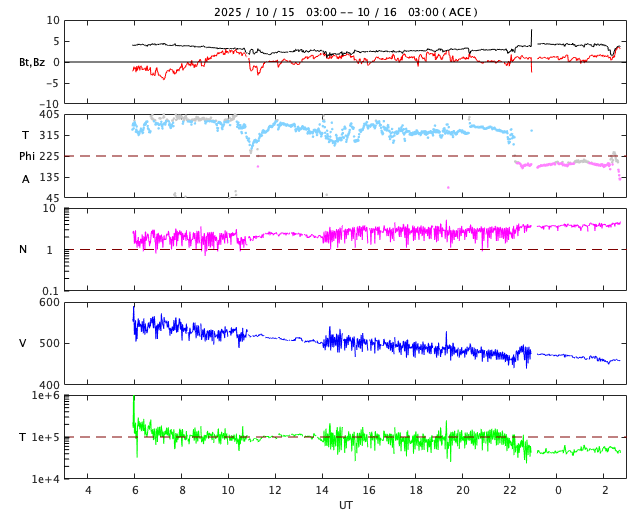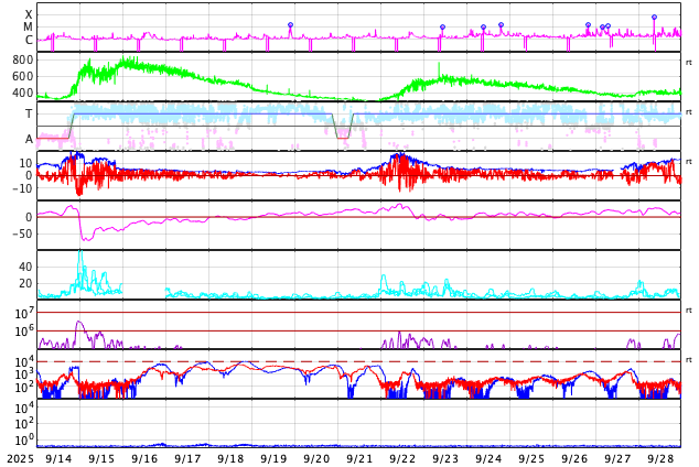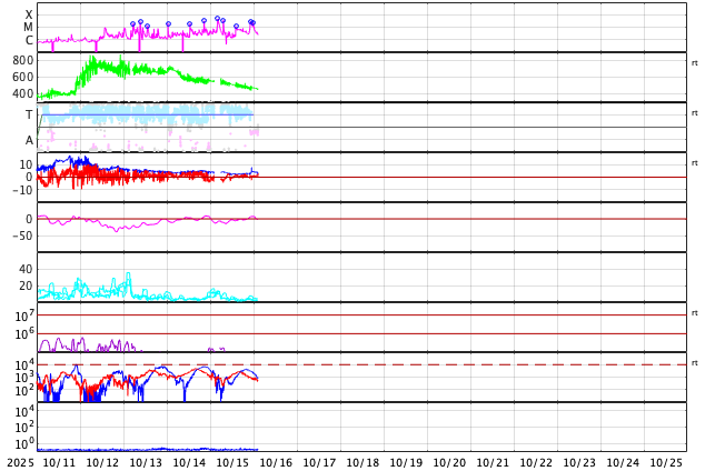 2025/10/16 11:58 更新 4246黒点群で、Mクラスフレアの発生が続いています。高速太陽風は終わりました。 担当 篠原 太陽の北西側(右上)の4246黒点群では、 活発なフレアの発生が続いています。 昨日のニュース以降では、 M3.7、M1.1、M2.7、M2.4、M1.1と 中規模フレアが5回発生しています。 15日23時(世界時14日14時)に発生したM1.1、 16日7時(世界時14日22時)のM2.7と、 その後のM2.4、M1.1のフレアの様子を、 GOES衛星SUVI 131の動画で紹介します。 これらのフレアでは、CME(コロナ質量放出)も発生していて、 SOHO衛星LASCO C2、C3では、 太陽の右上へ広がる様子が観測されています。 横向きに近い噴出なので、地球への影響はないでしょう。 4266群は、この後太陽の端に近付きます。 見えている間にどの様な活動を起こすでしょうか。 太陽風は、昨日の午後から速度はゆっくりと低下して、 550km/秒から460km/秒へ下がっています。 高速の状態は終わり、平均的な速度に戻っています。 磁場強度は、4nTから2nTへ下がり、 その後4nTに戻っています。 磁気圏は穏やかになっていて、 AE指数は、グラフの途中から変化が見られなくなっています。 GOES衛星SUVI 195では、 コロナホールが太陽の中心線に達しています。 3日後くらいから太陽風の速度が高まる可能性があります。 27日周期の図を見ると、 前周期は9月22日から速度が高まっていて、 これは、今回は10月19日に相当します。 ![]() 4246黒点群で発生した、M1.1の中規模フレア。 (c) GOES衛星SUVI 131 (NOAA)、(動画加工 : 宇宙天気ニュース) ![]() 4246黒点群で発生した、M2.7、M2.4、M1.1の中規模フレア。 (c) GOES衛星SUVI 131 (NOAA)、(動画加工 : 宇宙天気ニュース) ![]() 太陽の右上へ広がるCME。2つのフレアの動画に対応して、CMEが2回飛び出しています。 (c) SOHO衛星LASCO C2、C3 (ESA & NASA)、(動画加工 : 宇宙天気ニュース) ![]() GOES衛星SUVI 195カメラによる太陽コロナの様子 (c) GOES衛星SUVI 195 (NOAA) ![]() SDO衛星による太陽の可視光写真。SOHO衛星のWebページより取得しました。 (c) SDO (NASA) ![]() GOES衛星の太陽X線強度。赤・橙 = 0.1〜0.8 nm、青・紫 = 0.05〜0.4 nm (c) データ:NOAA/SWPC、作図:宇宙天気ニュース ![]() ACEが観測した太陽風の磁場(黒線は全体の強度、赤線は南北成分) 磁場の向き、プラズマの密度、速度、温度 (c) データ:NOAA/SWPC、作図:宇宙天気ニュース ![]() AE指数(速報値) 下段のAEグラフの値が高くなると、オーロラ活動が活発化しています。 (c) 京都大学WDC ![]() ![]() 27日の太陽周期に合わせた図 太陽が同じ面を地球に向けていた27日前の変化から、今後を予想することができます。 (c) 作図:宇宙天気ニュース