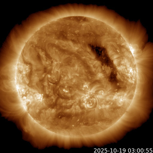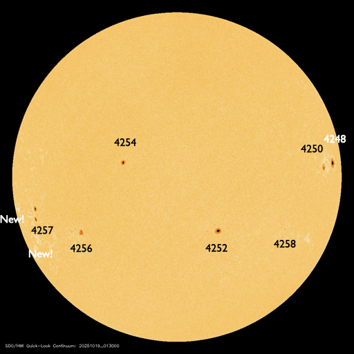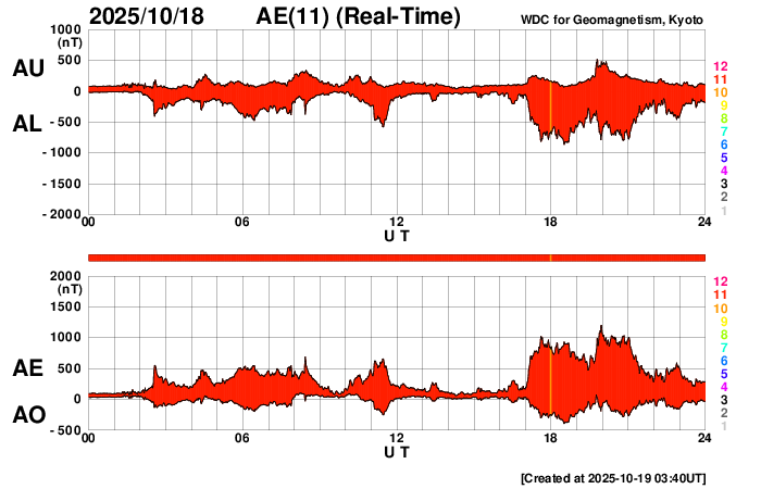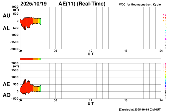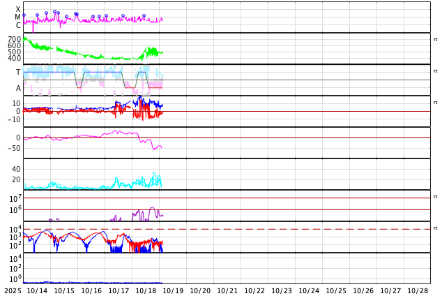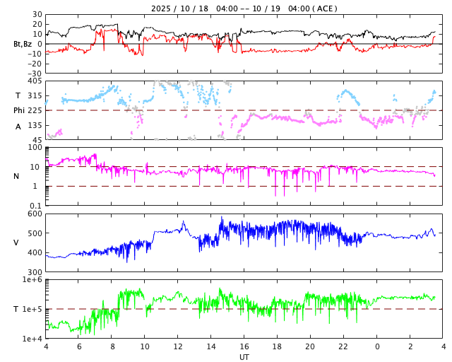 2025/10/19 12:41 更新 高速太陽風が到来し、速度は500km/秒に高まっています。4246群は見えなくなりました。 担当 篠原 昨夜、18日19時(世界時18日10時)過ぎに 太陽風の速度は500km/秒へ高まり、高速風が始まりました。 GOES衛星SUVI 195で注目していた コロナホールの影響がやって来た様です。 太陽風の速度は、以降も500km/秒前後で推移しています。 磁場強度は、速度が高まる前に20nTに強まる変化が発生し、 その後は10nT、グラフの最後は7nTくらいになっています。 27日周期の図を見ると、 太陽風速度の高まりは前周期よりも1日ほど早くやって来ました。 前周期は4日ほど速度の高まりが続いています。 今回はどのくらいの期間になるでしょうか。 磁場の南北成分は、グラフの後半は南向きになっています。 速度の高まりも重なって、磁気圏の活動は強まっています。 AE指数は、1000nTに達する大きい変化も発生しています。 グラフの最後では、南北成分は0nTに近付いています。 この後はどちら寄りで変化するでしょうか。 注目して下さい。 太陽は、4246黒点群の活動が続き、 C9.9、M1.2、M1.3、M1.5、C8.0、M1.0など、 小、中規模のフレアが続いています。 今日掲載の可視光写真では、 4246群は北西の端(右上)に沈んで、見えなくなっています。 この後は、太陽は静かになりそうです。
