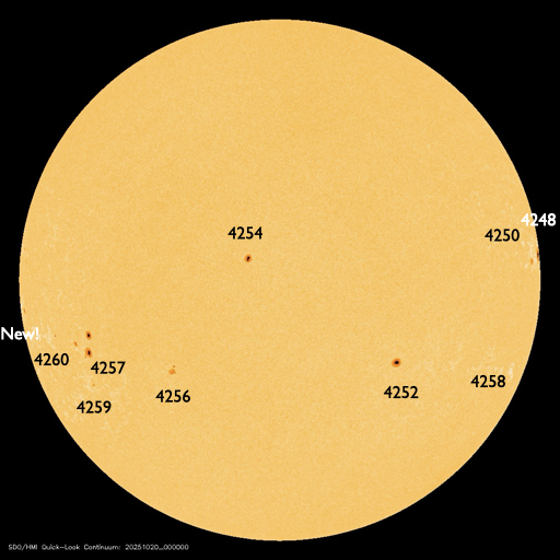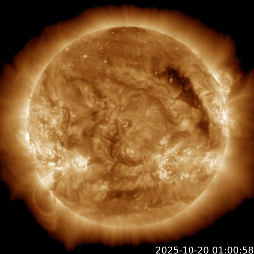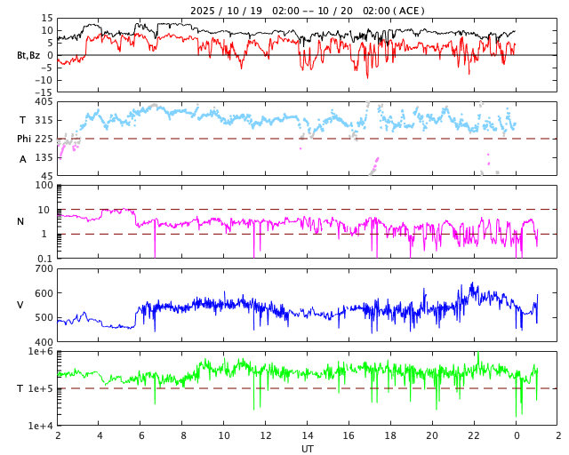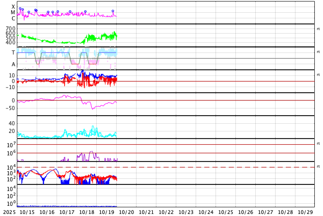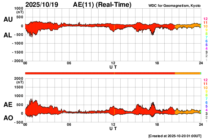 2025/10/20 10:18 更新 高速の太陽風が続いています。太陽は穏やかになりそうです。 担当 篠原 太陽風の速度は、500km/秒から550km/秒に上がり、 高速の状態が続いています。 磁場強度は、10nT前後と強まった状態で推移しています。 磁場の南北成分は、やや北寄りで推移しています。 磁気圏の活動は少し落ち着いて、 AE指数は、200〜500nTの小規模の活動が見られる程度です。 GOES衛星SUVI 195では、 コロナホールは北西側(右上)にだいぶ進んでいます。 高速太陽風は、始まって2日ほどが過ぎました。 前周期は4日ほど続いたのですが、今回はどうなるでしょうか。 太陽は、活発にフレアを起こしていた4246黒点群が 太陽の向こう側に進んだため、 X線グラフの変化は少なくなっています。 今朝、20日5時(世界時19日20時)に発生した M1.8の中規模フレアは、 向こう側に進んだ4246群で発生しています。 フレアの輝きの上の方が見えただけなので、 実際の規模はこれよりも大きかった可能性があります。 この後、太陽は穏やかに推移しそうです。