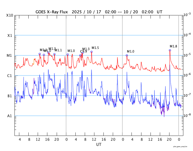 GOES衛星の太陽X線強度。赤・橙 = 0.1〜0.8 nm、青・紫 = 0.05〜0.4 nm (c) データ:NOAA/SWPC、作図:宇宙天気ニュース ![]() | ||||||||||||||||||||||||||||||||||||||||||||||||||||||||||||||||||||||||||||||||||||||||||||||||||||||||||||||||||||||||||||||||||||||||||||||||||||||||||||||||||||||||||||||||||||||||||||||||||||||||||||||||||||||||||||||||||||||||||||||||||||||||||||||||||||||||||||||||||||||||||||||||