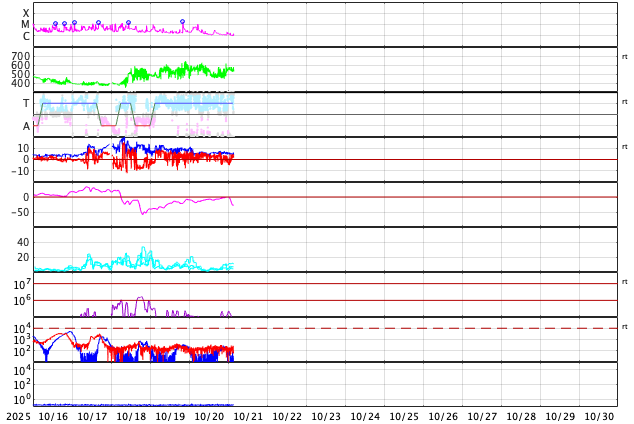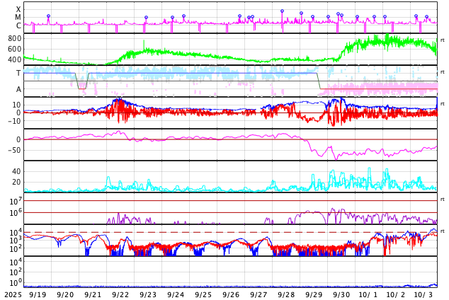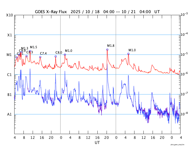 GOES衛星の太陽X線強度。赤・橙 = 0.1〜0.8 nm、青・紫 = 0.05〜0.4 nm (c) データ:NOAA/SWPC、作図:宇宙天気ニュース ![]() | ||||||||||||||||||||||||||||||||||||||||||||||||||||||||||||||||||||||||||||||||||||||||||||||||||||||||||||||||||||||||||||||||||||||||||||||||||||||||||||||||||||||||||||||||||||||||||||||||||||||||||||||||||||||||||||||||||||||||||||||||||||||||||||||||||||