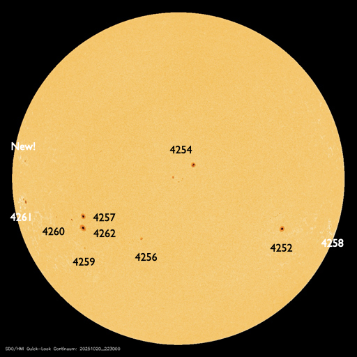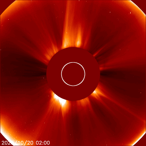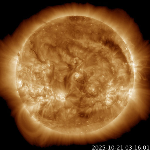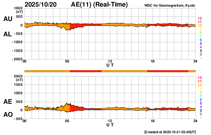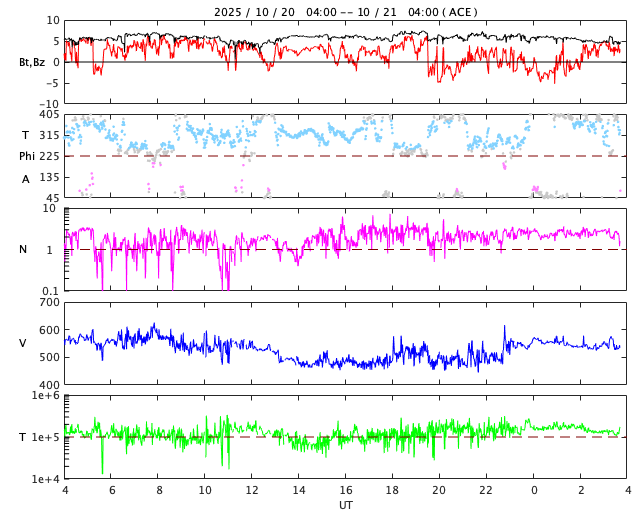 2025/10/21 12:52 更新 500km/秒台の高速太陽風が続いています。磁気圏は比較的穏やかです。 担当 篠原 太陽風は、500〜550km/秒の間で高速の状態が続いています。 磁場強度は、5〜6nTと平均的な状態です。 27日周期の図を見ると、 高速の太陽風は始まって3日が過ぎようとしています。 前周期は4日ほどで終わったのですが、 今回はもう少し続くかもしれません。 磁場の南北成分は、比較的北寄りで推移しています。 磁気圏は比較的穏やかな状態で、 AE指数は、小規模の変化が時々発生する程度です。 GOES衛星SUVI 195では、 コロナホールは北西の端(右上)に近付いています。 高速の風がどこまで続くか注目して下さい。 太陽は、北西の端(右上)の向こう側に進んだ 4246黒点群や4248群などで活動が続いている様で、 SOHO衛星LASCO C2、C3を見ると、 CME(コロナ質量放出)が太陽の右上に次々に飛び出しています。 およそ1日分の動画を掲載します。 太陽のこちら側は穏やかになっていて、 X線グラフは変化が少なくなっています。 ![]() 太陽の右上へ次々に飛び出すCME。太陽の向こう側で発生した噴出です。 (c) SOHO衛星LASCO C2、C3 (ESA & NASA)、(動画加工 : 宇宙天気ニュース) ![]() GOES衛星SUVI 195カメラによる太陽コロナの様子 (c) GOES衛星SUVI 195 (NOAA) ![]() SDO衛星による太陽の可視光写真。SOHO衛星のWebページより取得しました。 (c) SDO (NASA) ![]() ACEが観測した太陽風の磁場(黒線は全体の強度、赤線は南北成分) 磁場の向き、プラズマの密度、速度、温度 (c) データ:NOAA/SWPC、作図:宇宙天気ニュース ![]() AE指数(速報値) 下段のAEグラフの値が高くなると、オーロラ活動が活発化しています。 (c) 京都大学WDC ![]() ![]() 27日の太陽周期に合わせた図 太陽が同じ面を地球に向けていた27日前の変化から、今後を予想することができます。 (c) 作図:宇宙天気ニュース