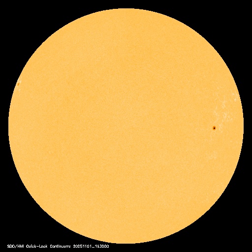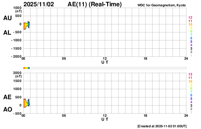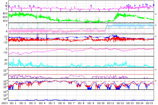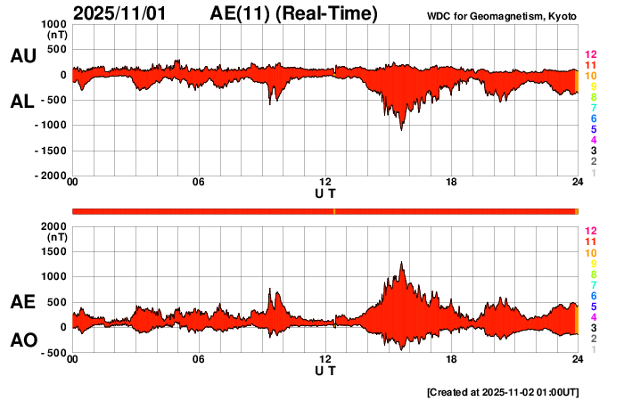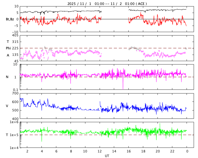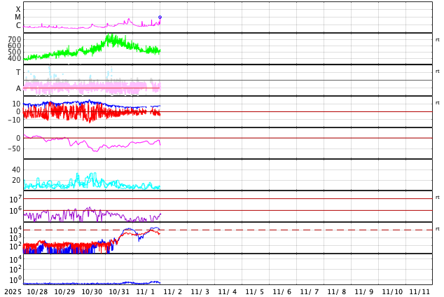 2025/11/ 2 10:00 更新 高速の太陽風が続いていますが、速度は500km/秒に下がっています。 担当 篠原 太陽風の速度は低下が続き、 580km/秒から500km/秒へ下がっています。 高速の状態は続いていますが、 今回の高速風はこのまま終わるのでしょうか。 磁場強度は5nTから8nTへ少し強まっています。 磁場の南北成分は、やや南寄りで変化しています。 磁気圏はやや活動的な状態で推移している様です。 AE指数を見ると、1300nTに達する大きい変化が発生しています。 太陽風のグラフの途中のデータが欠けている頃に起きているので、 この時に、磁場が一時的に南向きに強まったのかもしれません。 GOES衛星SUVI 195では、 北東側(左上)にコロナホールが広がっています。 5日後くらいからこの領域の影響が始まる可能性があります。 太陽は、西側(右側)の4267黒点群で C4.7の小規模フレアが発生しています。 可視光写真を見ると、北東の端に黒点群が現れています。 前の周期に活発に活動していた4246黒点群が回帰して来た様です。