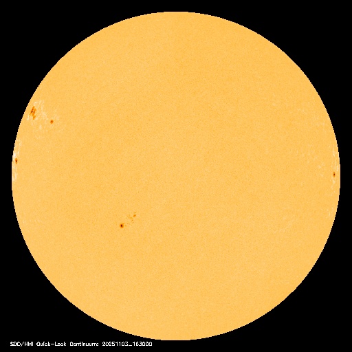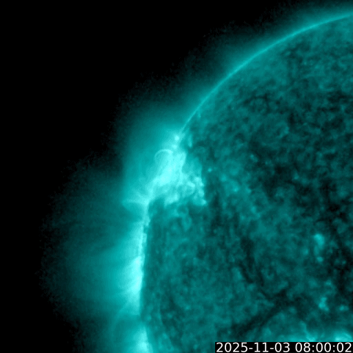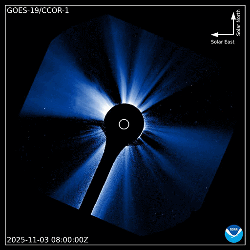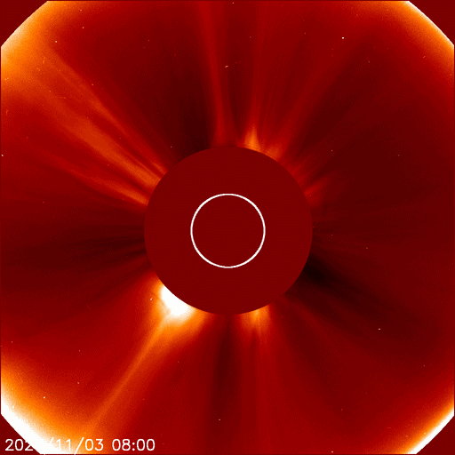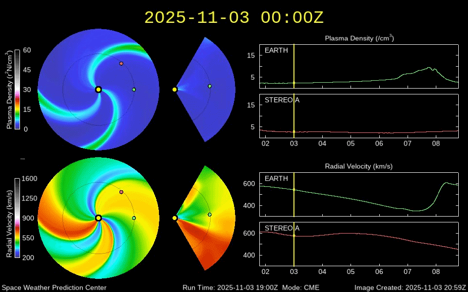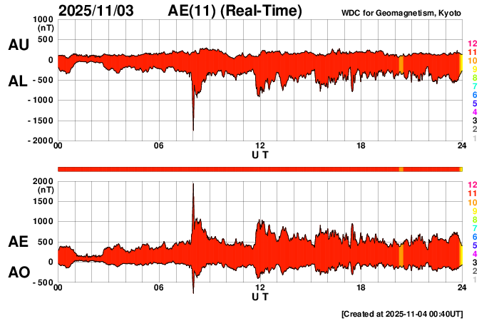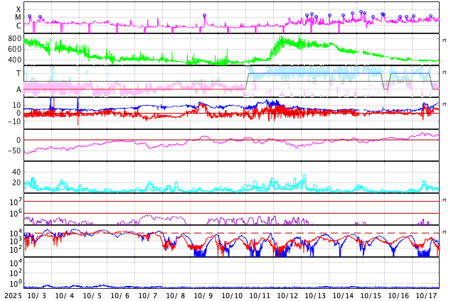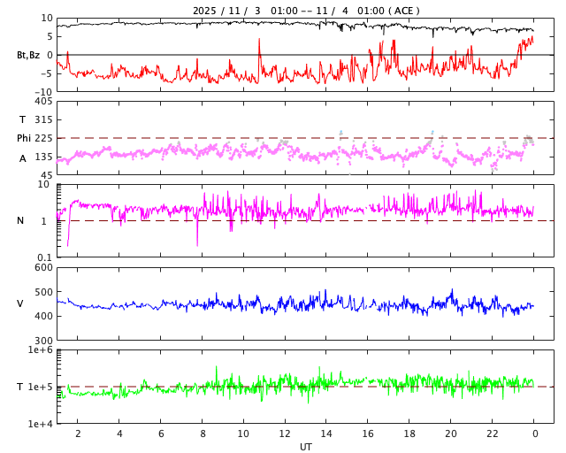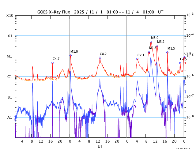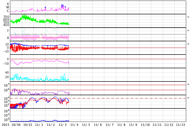 2025/11/ 4 09:58 更新 M5.0など中規模フレアが4回発生しています。太陽風は平均的な速度です。 担当 篠原 太陽の北東の端(左上)に4274黒点群が現れ、 昨夕、3日17時半(世界時3日8時半)にM1.6、 昨夜、3日19時(世界時3日10時)にM5.0、 続く、3日21時半(世界時3日12時半)にM2.9、 そして、今日未明、4日2時(世界時3日17時)にM1.5と、 中規模フレアが次々に発生しています。 M1.6、M5.0、M2.9のフレアの様子を、 GOES衛星SUVI 131の動画で紹介します。 このフレアでは、CME(コロナ質量放出)も発生しています。 GOES衛星CCOR-1とSOHO衛星LASCO C2、C3の動画を掲載します。 SOHO衛星の動画は途中の画像が欠けているので、 CMEが急に広がる様な見え方になっています。 フレアが太陽の東端で発生しているので、 CMEは太陽の左側に大きく広がっています。 NOAA/SWPCの太陽風予報を見ると、 噴出は地球(緑色の丸)に対して横向きになっています。 一方、CCOR-1やLASCO C3の動画を見ると、 噴出は太陽の左側だけでなく、 淡いですが右側にも広がっている様です。 このため、弱い太陽風の乱れが地球にやって来るかもしれません。 到来まで2日くらいかかると考えると、 明日、5日の夜くらいでしょうか。 乱れはやって来るのか、注目して下さい。 太陽では、今朝もC4.5、C8.8の小規模フレアが発生しています。 また、南東の端(左下)の向こう側にも活動的な領域がある様です。 引き続き注目してください。 太陽風は、速度は450km/秒から430km/秒へ少し下がり、 平均的な速さが続いています。 磁場強度も9nTから7nTへ少し下がっています。 磁場の南北成分は、 昨日のニュース以降、南向きに傾向が変わり、 -5nTを超えるくらいの変化が今朝まで続いています。 磁気圏の活動も活発になり、 AE指数は、2000nTの大きい変化が一瞬発生していますが、 その他は500〜1000nTの中規模の変化が連続的に発生しています。 太陽風のグラフの最後では、 磁場の南北成分は、0nT付近に上がっています。 この後はどの様に推移するでしょうか。 GOES衛星SUVI 195を見ると、 北半球のコロナホールが太陽の中心線に達しています。 3日後の7日くらいから、 この領域の影響で太陽風の速度が高まる可能性があります。 27日周期の図を見ると、前回は700km/秒に達する高速風が到来しています。 今回はどうなるでしょうか。