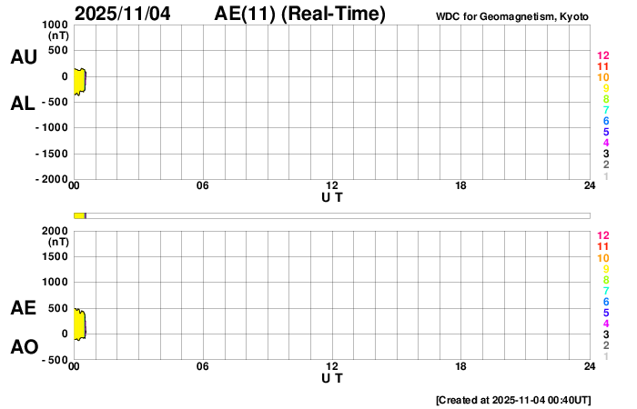 (c) GOES衛星SUVI 131 (NOAA)、(動画加工 : 宇宙天気ニュース) ![]() CMEが太陽の左側に広がっています。淡いですがCMEは右側にも広がっている様です。 (c) GOES衛星CCOR-1 (NOAA)、(動画加工 : 宇宙天気ニュース) ![]() 太陽の左側に広がるCME。 (c) SOHO衛星LASCO C2、C3 (ESA & NASA)、(動画加工 : 宇宙天気ニュース) ![]() 太陽風の乱れは、地球に対して横向きに飛び出しています。 (c) WSA-ENLIL太陽風予報 (NOAA)、(動画加工 : 宇宙天気ニュース) ![]() GOES衛星のSUVI 195カメラによる太陽コロナの様子 (c) NOAA/SWPC ![]() SDO衛星による太陽の可視光写真(SOHO衛星の画像ページより取得)。 マウスの矢印を写真に重ねると、黒点番号付きの写真に切り替わります。 (c) SDO (NASA) ![]() GOES衛星の太陽X線強度。赤・橙 = 0.1〜0.8 nm、青・紫 = 0.05〜0.4 nm (c) データ:NOAA/SWPC、作図:宇宙天気ニュース ![]() ACEが観測した太陽風の磁場(黒線は全体の強度、赤線は南北成分) 磁場の向き、プラズマの密度、速度、温度 (c) データ:NOAA/SWPC、作図:宇宙天気ニュース ![]() AE指数(速報値) 下段のAEグラフの値が高くなると、オーロラ活動が活発化しています。 (c) 京都大学WDC ![]() ![]() 27日の太陽周期に合わせた図 太陽が同じ面を地球に向けていた27日前の変化から、今後を予想することができます。 (c) 作図:宇宙天気ニュース