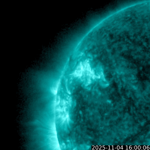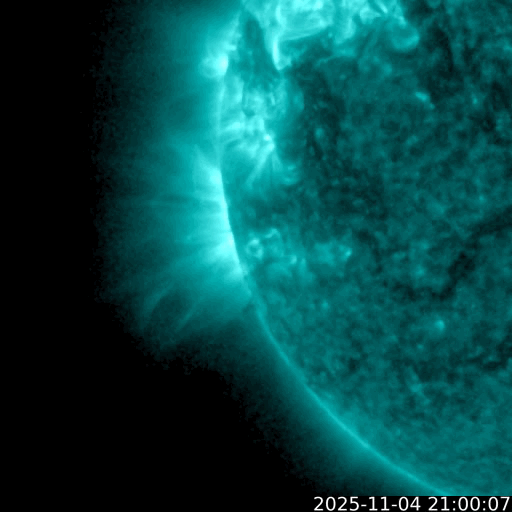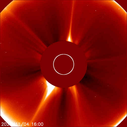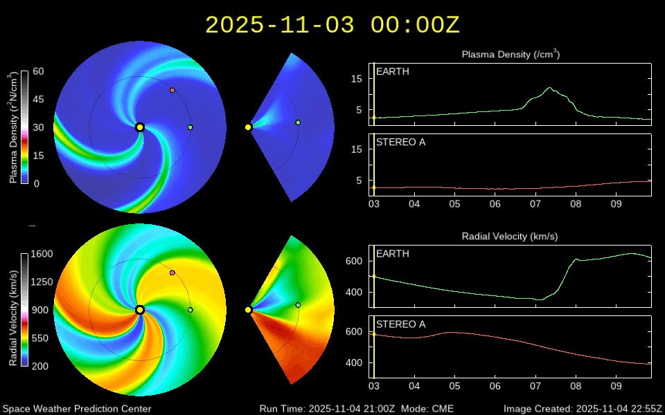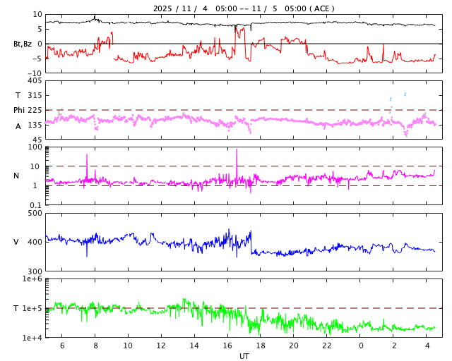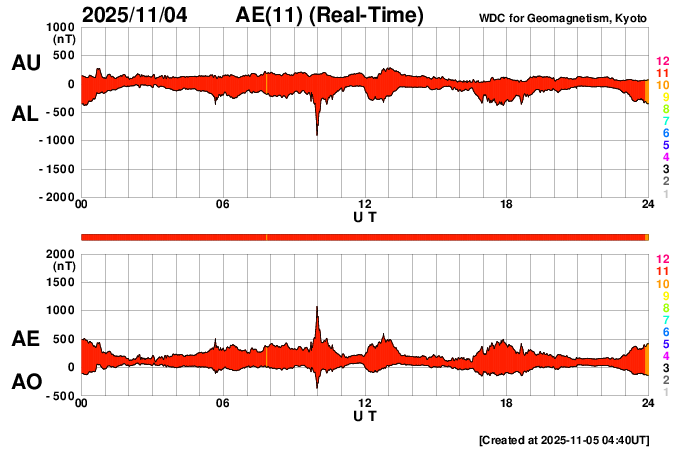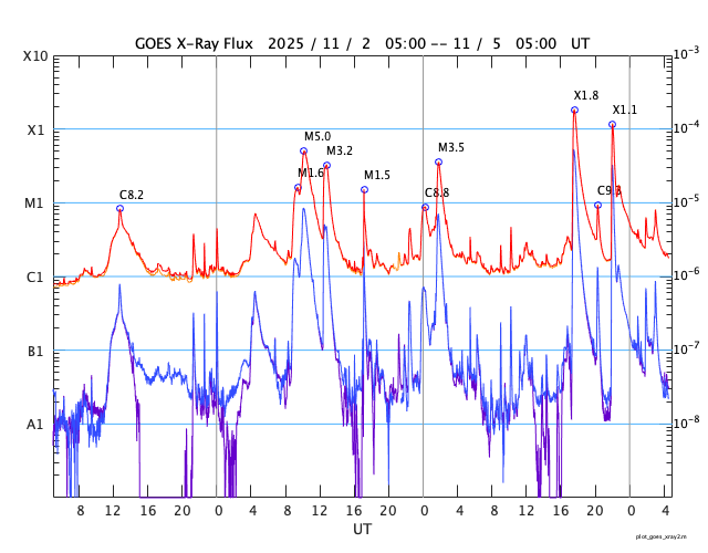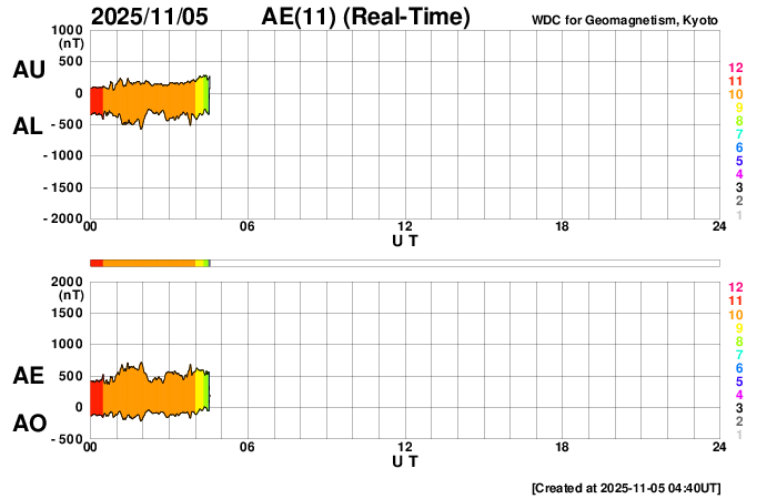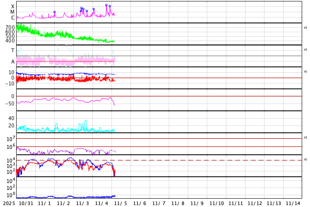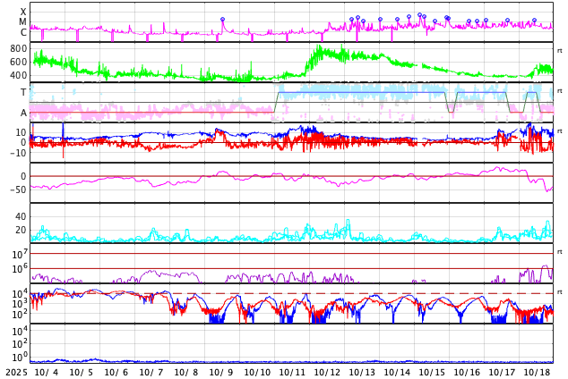 2025/11/ 5 13:50 更新 X1.8とX1.1の大規模フレアが発生しました。太陽風はやや低速です。 担当 篠原 太陽の北東(左上)の4274黒点群で、 今日未明、5日2時半(世界時4日17時半)に、 X1.8の大規模フレアが発生しました。 GOES衛星SUVI 131の動画を掲載します。 この規模のフレアの発生は、世界時6月19日のX1.9以来で、 4か月半ぶりです。 そして、今朝、5日8時半(世界時4日23時半)には、 南東の端(左下)の少し向こう側で、 X1.21の大規模フレアが発生しました。 昨日のニュースで、 南東側にも活発な領域がありそうだと書いていましたが、 そこで規模の大きい活動が発生した様です。 これらのXフレアに伴って、CME(コロナ質量放出)が発生しています。 SOHO衛星LASCO C2、C3では、 太陽から左上へ広がるCMEと、 左下へ広がるCMEが観測されています。 どちらも横向きに近い噴出なので、 地球への影響はなさそうです。 NOAA/SWPCの太陽風予報では、 昨日紹介したM5.0フレアのCMEに続いて、 太陽から広がるCMEの様子が描かれています。 北東の4274群と南東の端にこれから現れる黒点群の、 今後の活動に注目して下さい。 太陽風は、速度が400km/秒から370km/秒へ下がり、 やや低速になっています。 磁場強度は、7nTから6nTに少し下がっています。 こちらは平均的な状態です。 磁場の南北成分は、-5nT程度の南向きの変化が続いています。 速度が下がってきたので、磁気圏への影響は限定的で、 AE指数は、500nT前後の中規模の変化が、 時間をおいて発生しています。 GOES衛星SUVI 195の太陽コロナ写真では、 コロナホールは西側に進んでいます。 明後日くらいから影響が始まって、 太陽風の速度が高まる可能性があります。 ![]() 4274黒点群で発生した、X1.8の大規模フレア。 (c) GOES衛星SUVI 131 (NOAA)、(動画加工 : 宇宙天気ニュース) ![]() 南東の端の少し向こう側で発生した、X1.1の大規模フレア。 (c) GOES衛星SUVI 131 (NOAA)、(動画加工 : 宇宙天気ニュース) ![]() CMEが太陽の左上と左下に飛び出しています。 (c) SOHO衛星LASCO C2、C3 (ESA & NASA)、(動画加工 : 宇宙天気ニュース) ![]() CMEの太陽風の乱れは、地球に対し横向きに広がっています。 (c) WSA-ENLIL太陽風予報 (NOAA)、(動画加工 : 宇宙天気ニュース) ![]() GOES衛星のSUVI 195カメラによる太陽コロナの様子 (c) NOAA/SWPC ![]() SDO衛星による太陽の可視光写真(SOHO衛星の画像ページより取得)。 マウスの矢印を写真に重ねると、黒点番号付きの写真に切り替わります。 (c) SDO (NASA) ![]() GOES衛星の太陽X線強度。赤・橙 = 0.1〜0.8 nm、青・紫 = 0.05〜0.4 nm (c) データ:NOAA/SWPC、作図:宇宙天気ニュース ![]() ACEが観測した太陽風の磁場(黒線は全体の強度、赤線は南北成分) 磁場の向き、プラズマの密度、速度、温度 (c) データ:NOAA/SWPC、作図:宇宙天気ニュース ![]() AE指数(速報値) 下段のAEグラフの値が高くなると、オーロラ活動が活発化しています。 (c) 京都大学WDC ![]() ![]() 27日の太陽周期に合わせた図 太陽が同じ面を地球に向けていた27日前の変化から、今後を予想することができます。 (c) 作図:宇宙天気ニュース