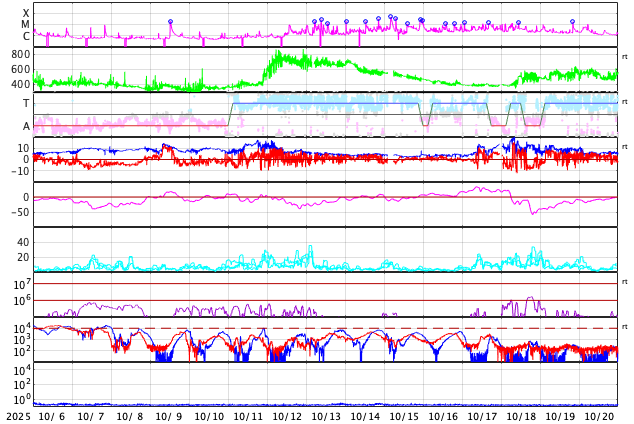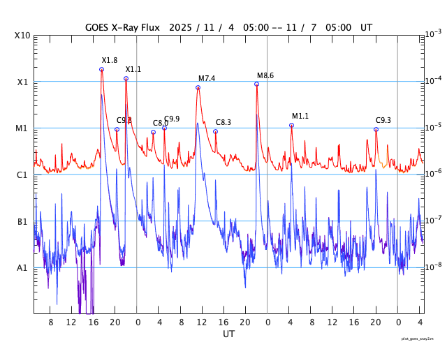 GOES衛星の太陽X線強度。赤・橙 = 0.1〜0.8 nm、青・紫 = 0.05〜0.4 nm (c) データ:NOAA/SWPC、作図:宇宙天気ニュース ![]() | ||||||||||||||||||||||||||||||||||||||||||||||||||||||||||||||||||||||||||||||||||||||||||||||||||||||||||||||||||||||||||||||||||||||||||||||||||||||||||||||||||||||||||||||||||||||||||||||||||||||||||||||||||||||||||||||||||||||||||||||||||||||||||||||||||||||||||||||||||||||||||||||||