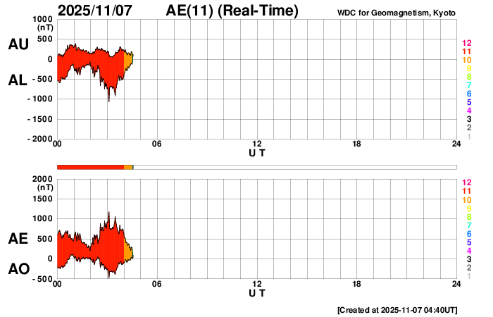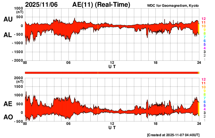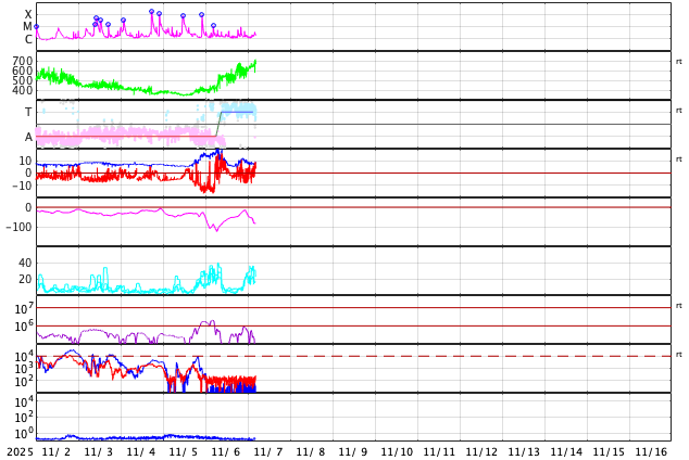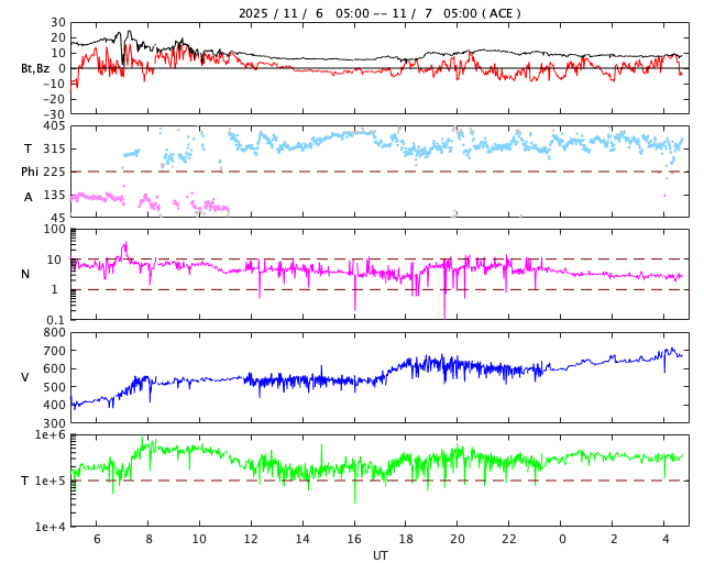 2025/11/ 7 13:53 更新 太陽風の速度は670km/秒に高まっています。磁気圏の活動も活発になっています。 担当 篠原 6日の午後以降、太陽風の速度が次第に高まり、 現在、670km/秒の高速風に達しています。 最初の高まりは、6日15時(世界6日6時)頃からで、 400km/秒と平均的な速度から550km/秒と高速の状態に変わりました。 今日未明、7日2時(世界時6日17時)には600km/秒へ、 そして、今朝、7日9時(世界時7日0時)には、 650km/秒へ高まる変化が発生しています。 昨日のニュースでお知らせした、 5日夜のM7.4フレアに関係する変化としては、 昨日午後の最初の高まりは早すぎる様に思うので、 これは、コロナホールに関係する変化かもしれません。 今日未明の2つめの変化についても、 フレアから1日半もかかっていないので、 600km/秒程度の高まりでは早すぎるように感じるのですが、どうでしょうか。 いろいろな変化が重なって分かりにくくなっている印象ですが、 引き続き太陽風の変化に注目して下さい。 太陽風の磁場強度は、 昨日の午後に15nTから20nTに強まる変化が発生していますが、 以降は一旦6nTへ下がり、その後10nTに強まっています。 全体としては大きな変化にはなっていません。 磁場の南北成分は、 昨日のニュースの頃の南向きの強まりがしばらく続いた後は、 北寄りの傾向に変わり、その後、0nT付近で推移する様になっています。 このため、速度は高まっていますが、 磁気圏活動の強まりは中規模に留まっていて、 AE指数は500〜1000nTの変化が続いています。 太陽風速度の高まりは、この後どの様に変化するでしょうか。 磁場の南北成分の変化も注目して下さい。 太陽は、フレアの発生はやや落ち着いています。 南東(左下)の4276黒点群とその付近で、 M1.1の中規模フレア、C9.3の小規模フレアが発生し、 北東(左上)の4274黒点群では、 C5.3、C4.2、C3.6などの小規模フレアが発生しています。 これらの領域では、小さい活動は頻繁に発生しているので、 引き続き、フレアの発生に注目して下さい。