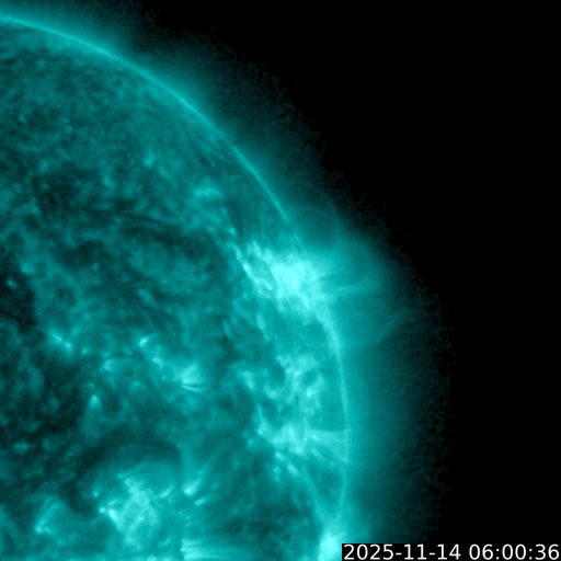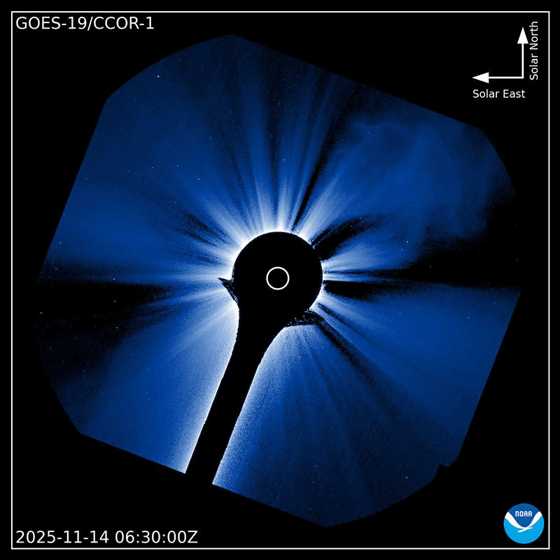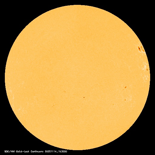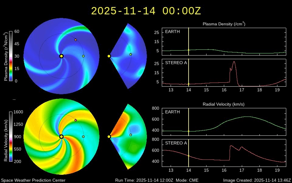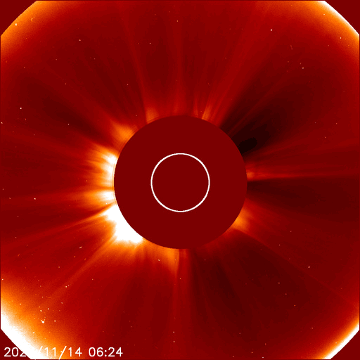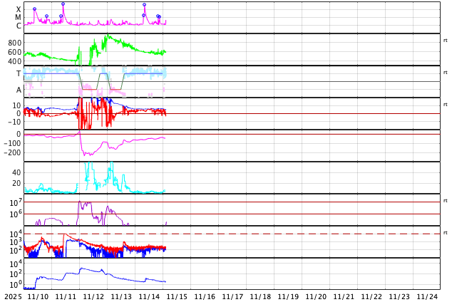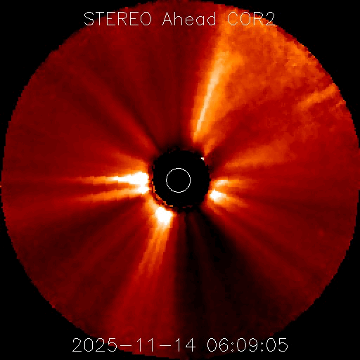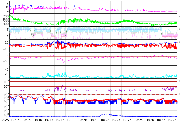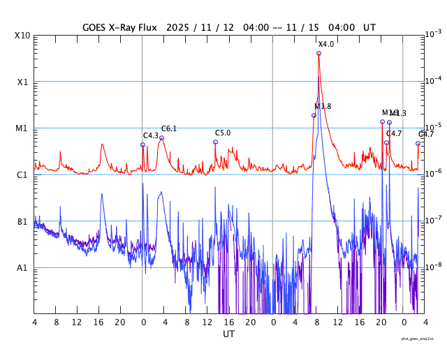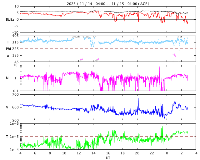 2025/11/15 12:08 更新 X4.0の大規模フレアが発生しました。太陽風は高速の状態が続いています。 担当 篠原 昨夕、14日16時半(世界時14日7時半)に、 太陽の北西の端(右上)に近い4274黒点群で、 X4.0の大規模フレアが発生しました。 GOES衛星SUVI 131の動画を掲載します。 4274群のXフレアは、11日のX5.1以来です。 4274群では、11月3日に北東の端(左上)に現れてから、 X1.8、X1.7、X1.2、X5.1、X4.0と、 Xフレアが5回発生しています。 このフレアに伴って、CME(コロナ質量放出)が発生しています。 GOES衛星CCOR-1、SOHO衛星LASCO C2、C3を見ると、 コロナのガスは太陽の右上側に濃く飛び出しています。 しかし、太陽の左側にも淡い広がりが見えています。 このため、CMEによる太陽風の乱れは、 地球方向にも向かっている可能性があります。 NOAA/SWPCの太陽風予報では、 CMEは地球(緑丸)に対して横向きに広がっていて、 影響はほとんどなさそうです。 しかし、CMEの広がり方を見ると、 弱い変化くらいはやって来るかもしれません。 到来まで2日くらいかかると考えると、明日の夕方以降でしょうか。 太陽風の変化に注目して下さい。 太陽風予報の動画を見ると、 CMEは、地球(緑丸)の左上方に位置している STEREO Ahead衛星(赤丸)に向かっています。 STEREO Ahead衛星のCOR2を見ると、 CMEは右側がより濃くなっていますが、 太陽全体を囲んで広がるハロー型になっています。 地球側から見たCMEの広がりと比べると、 噴出の立体的な様子が感じられます。 4274群では、その後、 M1.3、M1.3と中規模フレアが2回発生しています。 黒点群は西の端に達していて、 この後、向こう側へ進んで見えなくなります。 太陽風は、速度が620km/秒から550km/秒へ下がり、 グラフの最後で600km/秒に少し上がっています。 高速の状態は続いています。 磁場強度は、6nTから5nTへ少し下がっています。 磁場の南北成分は、北寄りの傾向が続いています。 磁気圏は穏やかで、AE指数はほとんど変化のない状態です。 GOES衛星SUVI 195を見ると、 北半球のコロナホールは太陽の西側に進んでいて、 明日くらいから影響が始まる可能性があります。 CMEの乱れと重なる様な変化になるかもしれません。 ![]() 4274黒点群で発生した、X4.0の大規模フレア。 (c) GOES衛星SUVI 131 (NOAA)、(動画加工 : 宇宙天気ニュース) ![]() CMEは太陽の右上寄りに広がっています。 (c) GOES衛星CCOR-1 (NOAA)、(動画加工 : 宇宙天気ニュース) ![]() C3(青色)の画像では、太陽の左側への広がりも見えます。 (c) SOHO衛星LASCO C2、C3 (ESA & NASA)、(動画加工 : 宇宙天気ニュース) ![]() 太陽風の乱れは、地球に対して横向きに広がっています。 (c) WSA-ENLIL太陽風予報 (NOAA)、(動画加工 : 宇宙天気ニュース) ![]() 太陽を地球よりも右斜めから観測しているSTEREO Ahead衛星から観測したCME。 (c) STEREO Ahead衛星COR2 (NASA)、(動画加工 : 宇宙天気ニュース) ![]() GOES衛星のSUVI 195カメラによる太陽コロナの様子 (c) NOAA/SWPC ![]() SDO衛星による太陽の可視光写真(SOHO衛星の画像ページより取得)。 マウスの矢印を写真に重ねると、黒点番号付きの写真に切り替わります。 (c) SDO (NASA) ![]() GOES衛星の太陽X線強度。赤・橙 = 0.1〜0.8 nm、青・紫 = 0.05〜0.4 nm (c) データ:NOAA/SWPC、作図:宇宙天気ニュース ![]() ACEが観測した太陽風の磁場(黒線は全体の強度、赤線は南北成分) 磁場の向き、プラズマの密度、速度、温度 (c) データ:NOAA/SWPC、作図:宇宙天気ニュース ![]() AE指数(速報値) 下段のAEグラフの値が高くなると、オーロラ活動が活発化しています。 (c) 京都大学WDC ![]() ![]() 27日の太陽周期に合わせた図 太陽が同じ面を地球に向けていた27日前の変化から、今後を予想することができます。 (c) 作図:宇宙天気ニュース