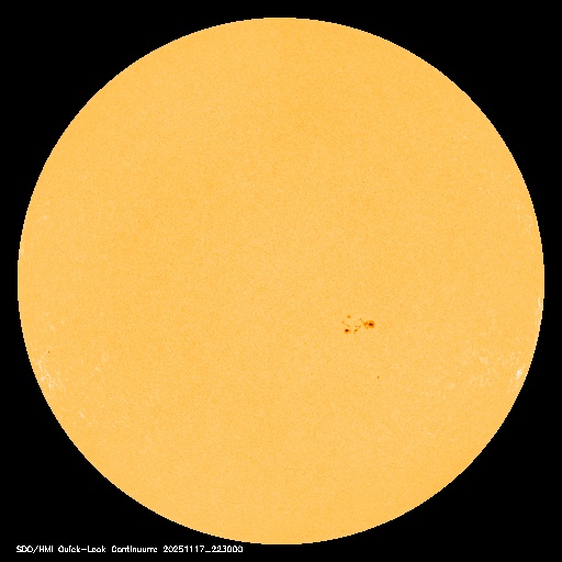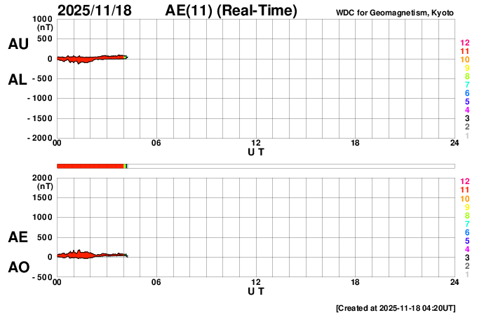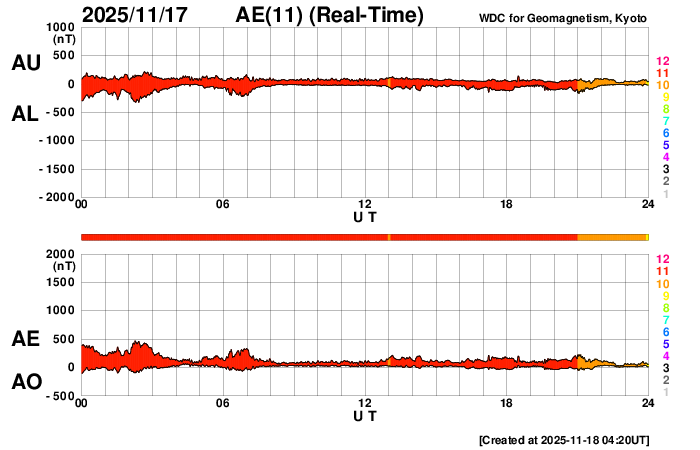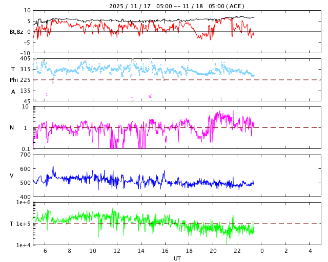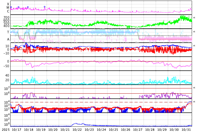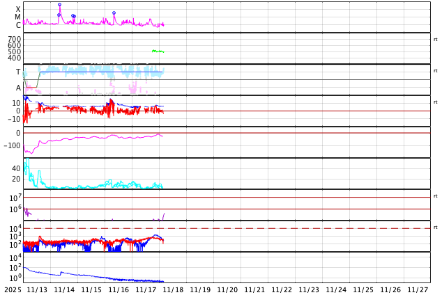 2025/11/18 13:39 更新 太陽風は高速の状態が続いています。10月の黒点相対数は 114.6 でした。 担当 篠原 Xフレアや磁気嵐などで報告がかなり遅れましたが、 WDC-SILSO より、10月の黒点相対数月平均値は、 114.6 と発表されています。 黒点相対数は、5月に78.5と大きく下がったものの、 その後、8月には133.5まで戻りましたが、 9月は129.8、10月は114.6と、以降は低下が続いています。 この変化だと、2026年の途中で100を割るくらいでしょうか。 太陽風は、速度が530km/秒から500km/秒へ少し下がっている様です。 高速の状態は続いています。 磁場強度は、5nTから6nTへ少し変化しています。 磁場の南北成分は、北寄りになっています。 磁気圏は穏やかで、AE指数は小さい変化が見られる程度です。 GOES衛星SUVI 195では、 コロナホールは北西の端(右上)に達しています。 太陽風の速度は、この後は下がって行きそうです。 太陽は、北西の端の向こう側に進んだ4274黒点群で活動が発生して、 C6.1の小規模フレアと、 太陽の右上へ広がるCME(コロナ質量放出)が発生しています。 太陽のこちら側は、 中心部南西側(右下)の4284群でC5.4の小規模フレアが発生しています。 その他は穏やかです。