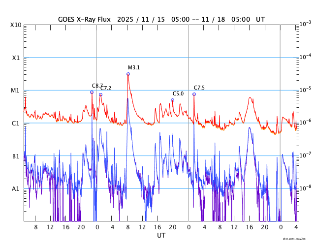 GOES衛星の太陽X線強度。赤・橙 = 0.1〜0.8 nm、青・紫 = 0.05〜0.4 nm (c) データ:NOAA/SWPC、作図:宇宙天気ニュース ![]() | |||||||||||||||||||||||||||||||||||||||||||||||||||||||||||||||||||||||||||||||||||||||||||||||||||||||||||||||||||||||||||||||||||||||||||||||||||||||||||||||||||||||||||||||||||||||||||||||||||||||||||||||||||||||||||||||||||||||||||||||||||||||||||||||||||||||||