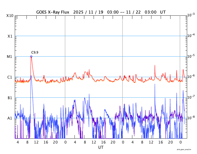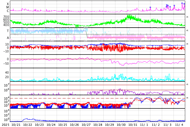 GOES衛星の太陽X線強度。赤・橙 = 0.1〜0.8 nm、青・紫 = 0.05〜0.4 nm (c) データ:NOAA/SWPC、作図:宇宙天気ニュース ![]() | |||||||||||||||||||||||||||||||||||||||||||||||||||||||||||||||||||||||||||||||||||||||||||||||||||||||||||||||||||||||||||||||||||||||||||||||||||||||||||||||||||||||||||||||||||||||||||||||||||||||||||||||||||||||||||||||||||||