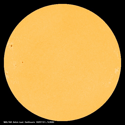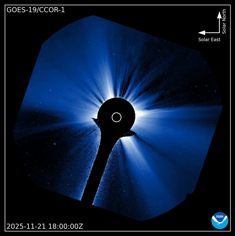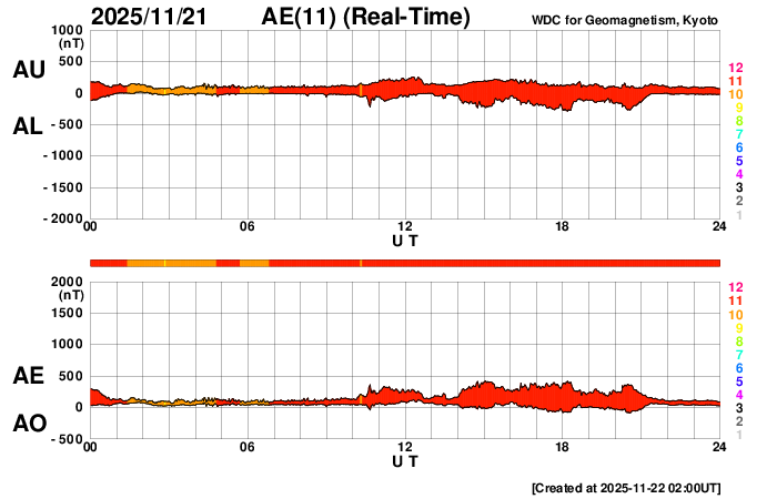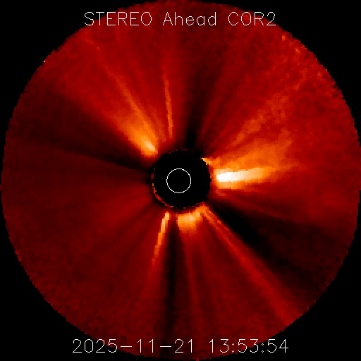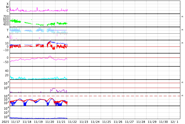 2025/11/22 11:10 更新 太陽風は平均的な状態です。太陽の向こう側でCMEが発生しました。 担当 篠原 太陽風の速度は、450km/秒から430km/秒へ少し下がっています。 平均的な状態です。 磁場強度は、今日未明にかけて10nTに強まった状態が続きましたが、 その後下がって、現在は6nTと平均的な状態です。 磁場の南北成分は、グラフの後半で弱い南寄りになっています。 磁気圏では小規模の活動が発生している様で、 AE指数は、300nTくらいの変化が半日ほど続いています。 GOES衛星SUVI 195では、 中心部東側(左側)の赤道付近にコロナホールが見えています。 広がりはあまり大きくありませんが、 4日後くらいからこの領域の影響で 太陽風の速度が高まるかもしれません。 また、南東の端(左下)にもコロナホールが見えています。 こちらの広がりはどうでしょうか。 太陽は、南東の端の4290黒点群で、 C3.8、C2.1、C2.3と小規模フレアが発生しています。 その他は穏やかな状態です。 一方、太陽の向こう側ではある程度の規模の活動が発生している様で、 GOES衛星CCOR-1では、 22日4時(世界時21日19時)頃に、 太陽の左上寄りに大きく広がるCME(コロナ質量放出)が観測されています。 太陽を地球よりも右斜めから観測しているSTEREO Ahead衛星COR2では、 CMEは太陽の右側に飛び出していて、太陽の向こう側の現象です。