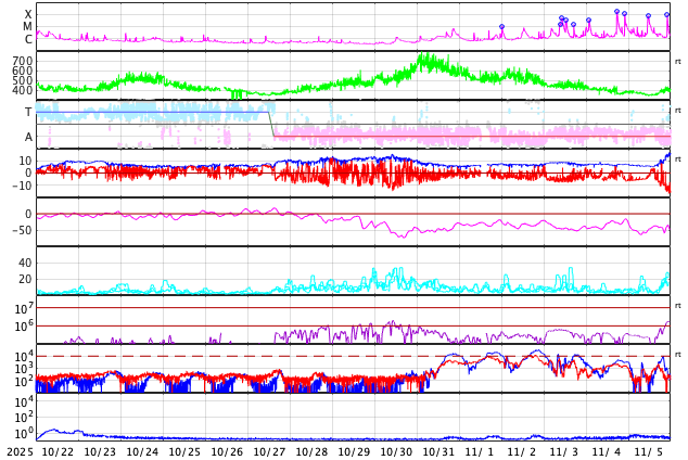 - 2025/11/18 13:39 太陽風は高速の状態が続いています。10月の黒点相対数は 114.6 でした。