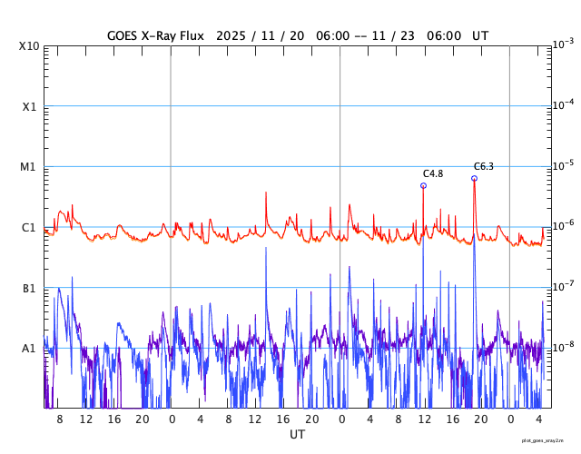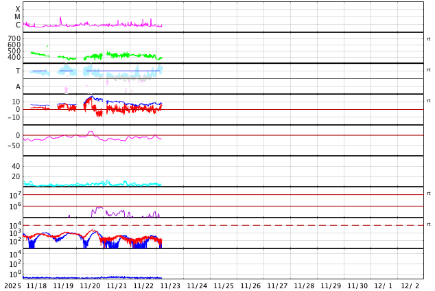 - 2025/11/20 11:42 太陽風はやや低速で、磁気圏は穏やかです。C9.9の小規模フレアが発生しました。