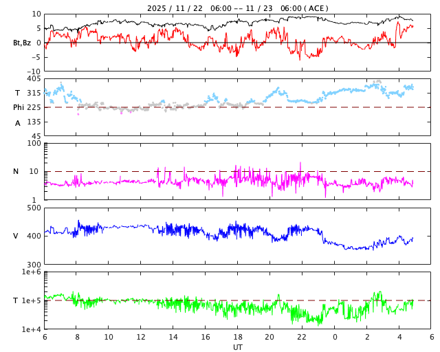 | 太陽風は速度、南向き磁場ともに静かです。 |
