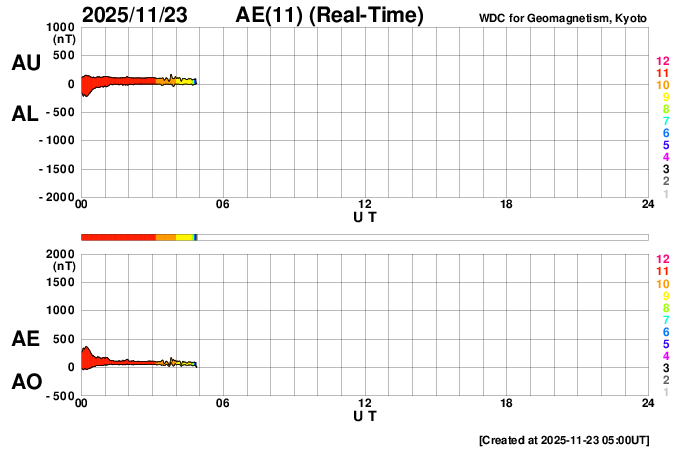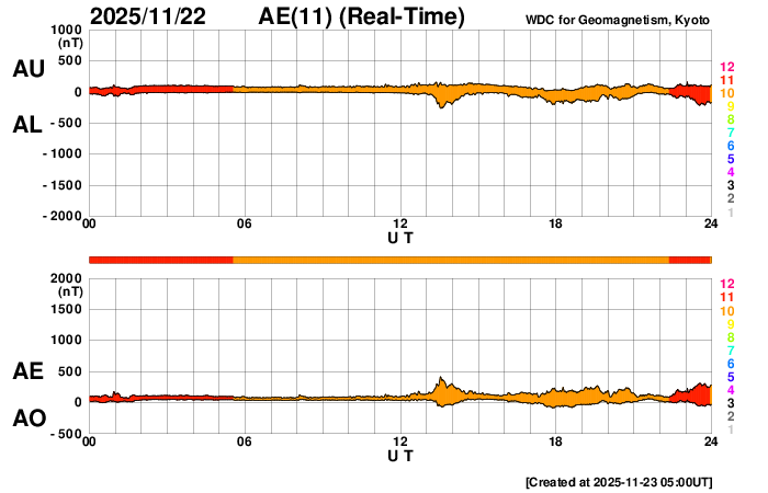 下段のAEグラフの値が高くなると、オーロラ活動が活発化しています。