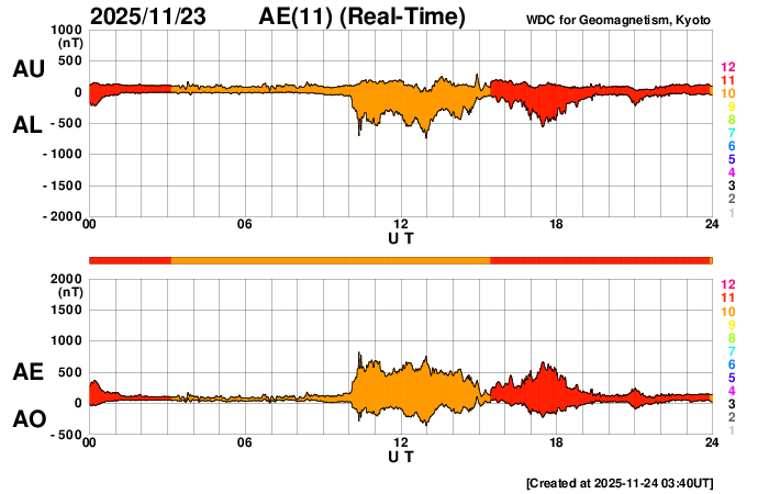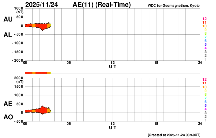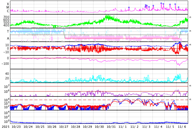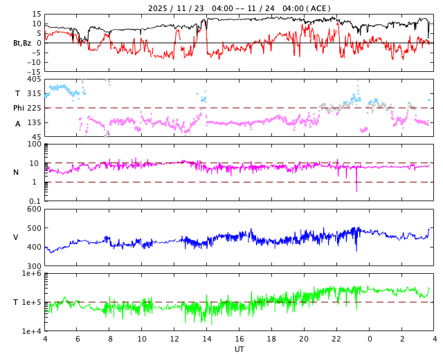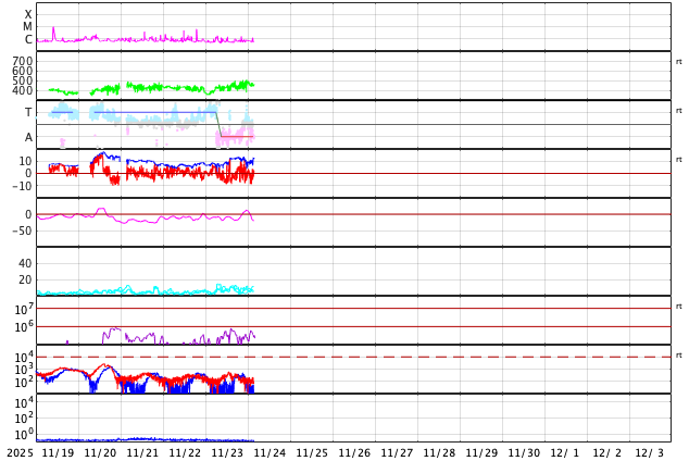 2025/11/24 12:54 更新 太陽風は平均的な速度が続いています。太陽は穏やかです。 担当 篠原 太陽風の速度は、400km/秒から450km/秒へ少し上がっています。 速さとしては平均的な状態が続いています。 磁場強度は、初めは8nTでしたが、 グラフの後半は12nT前後と強まった状態で推移しています。 磁場の南北成分は、南寄りで推移する時間帯があり、 AE指数は600nTの中規模の変化がしばらく続いています。 現在は磁場は0nT付近で変化していて、 AE指数の変化は小さくなり、磁気圏は穏やかです。 GOES衛星SUVI 195では、 中心部のコロナホールは西側(右側)へ進んでいます。 2日後くらいから太陽風の速度が高まりそうです。 注目して下さい。 太陽は穏やかな状態です。 X線グラフはC1の小さい活動が発生する程度です。