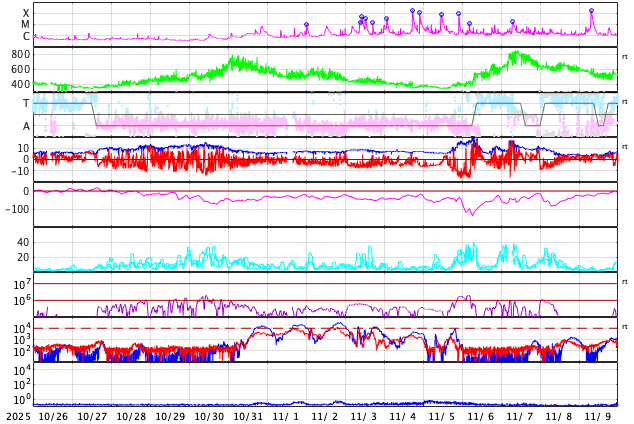 2025/11/23 14:08 太陽風は平均的な速度で安定しています。磁気圏は穏やかです。