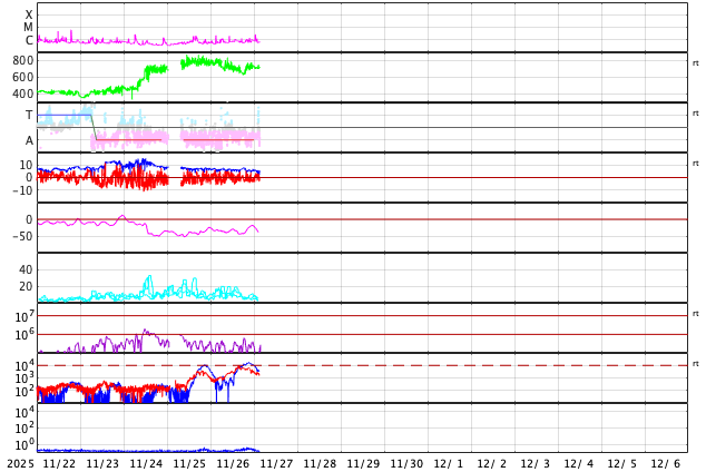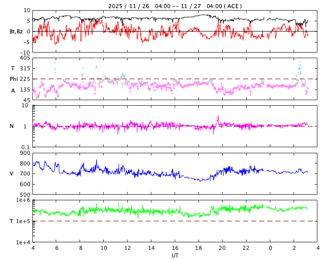 2025/11/26 11:54 太陽風は750km/秒の高速の状態で推移しています。磁気圏も活動的です。