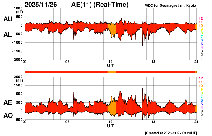 下段のAEグラフの値が高くなると、オーロラ活動が活発化しています。