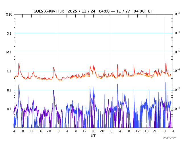 GOES衛星の太陽X線強度。赤・橙 = 0.1〜0.8 nm、青・紫 = 0.05〜0.4 nm
