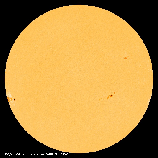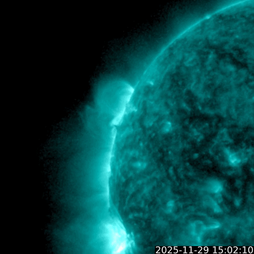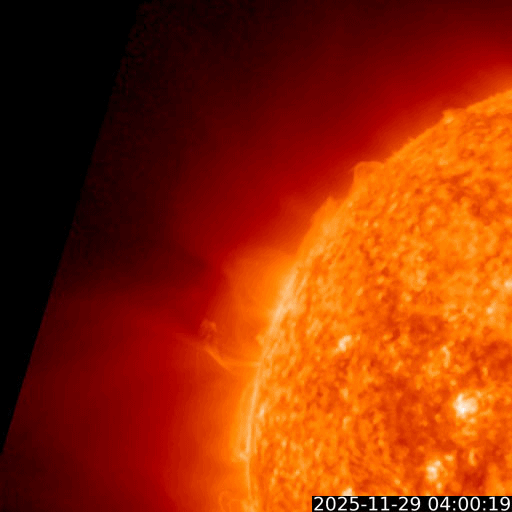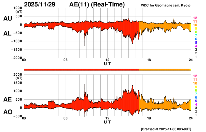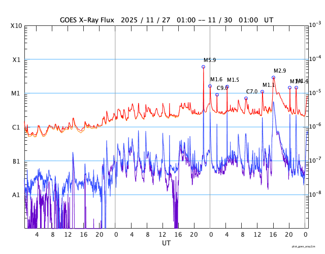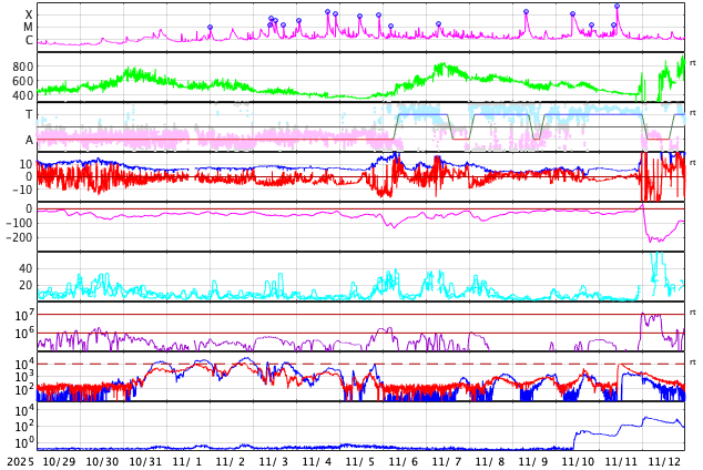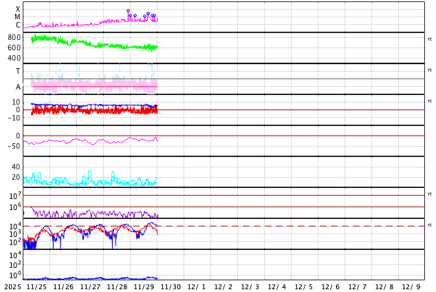 2025/11/30 10:00 更新 太陽の北東の端から活動的な領域が近づいています。太陽風は620km/秒と高速の状態です。 担当 篠原 太陽の北東の端(左上)で、活発な活動が見える様になっています。 29日14時(世界時29日5時)頃にプロミネンス噴出が発生して、 太陽の左側にCME(コロナ質量放出)が飛び出しています。 GOES衛星SUVI 304とSOHO衛星LASCO C2、C3の動画を掲載します。 そして、30日0時半(世界時29日15時半)には、 M2.8の中規模フレアが発生しています。 GOES衛星SUVI 131の動画を掲載します。 ここは、11月中旬にX5.1やX4.0などの大規模フレアを起こした 4274黒点群があった場所の様です。 可視光写真では、微かに黒点が見え始めています。 現在はどの様な状態でしょうか。 注目して下さい。 太陽の南東(左下)の4294黒点群でも活動が続いていて、 M1.5、M1.1、M1.4、M1.4と中規模フレアが発生しています。 太陽風は、620km/秒の高速の状態が安定して続いています。 磁場強度は、5〜6nTと平均的な状態です。 GOES衛星SUVI 195では、 コロナホールは南西の端(右下)に進んでほとんど見えなくなっていますが、 速度の高まりはどこまで続くでしょうか。 一方、北東のコロナホールは、太陽の中心線に近付いています。 4日後くらいから、こちらの影響が始まりそうです。 太陽風磁場の南北成分は、南寄りの変化が続いています。 磁気圏の活動は高まった状態が続いていて、 AE指数は、500nTの中規模の変化から、 1000〜1400nTの大きい変化も発生しています。 ![]() 太陽の北東の端で発生したプロミネンス噴出。 (c) GOES衛星SUVI 304 (NOAA)、(動画加工 : 宇宙天気ニュース) ![]() 太陽の左側へ広がるCME。 (c) SOHO衛星LASCO C2、C3 (ESA & NASA)、(動画加工 : 宇宙天気ニュース) ![]() 太陽の北東の端で発生した、M2.8の中規模フレア。 (c) GOES衛星SUVI 131 (NOAA)、(動画加工 : 宇宙天気ニュース) ![]() GOES衛星のSUVI 195カメラによる太陽コロナの様子 (c) NOAA/SWPC ![]() SDO衛星による太陽の可視光写真(SOHO衛星の画像ページより取得)。 マウスの矢印を写真に重ねると、黒点番号付きの写真に切り替わります。 (c) SDO (NASA) ![]() GOES衛星の太陽X線強度。赤・橙 = 0.1〜0.8 nm、青・紫 = 0.05〜0.4 nm (c) データ:NOAA/SWPC、作図:宇宙天気ニュース ![]() ACEが観測した太陽風の磁場(黒線は全体の強度、赤線は南北成分) 磁場の向き、プラズマの密度、速度、温度 (c) データ:NOAA/SWPC、作図:宇宙天気ニュース ![]() AE指数(速報値) 下段のAEグラフの値が高くなると、オーロラ活動が活発化しています。 (c) 京都大学WDC ![]() ![]() 27日の太陽周期に合わせた図 太陽が同じ面を地球に向けていた27日前の変化から、今後を予想することができます。 (c) 作図:宇宙天気ニュース