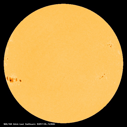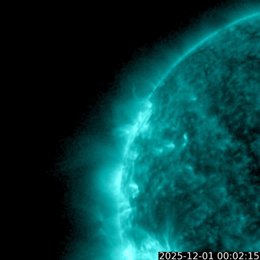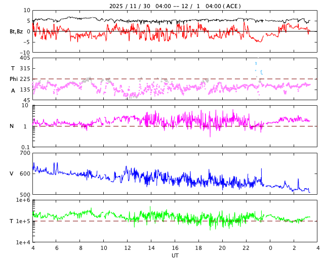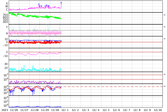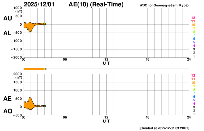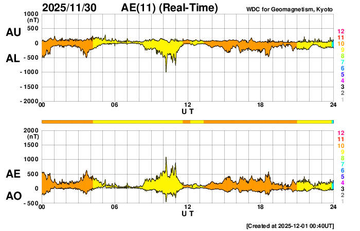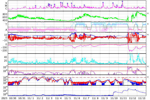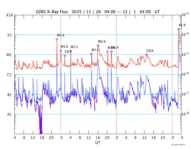 2025/12/ 1 12:32 更新 X1.9の大規模フレアが発生しました。太陽風は高速ですが、520km/秒と次第に低下しています。 担当 篠原 太陽の北東の端(左上)で、1日11時半(世界時1日2時半)に、 X1.9の大規模フレアが発生しました。 昨日のニュースで注目していた領域です。 Xクラスのフレアの発生は、 世界時11月14日のX4.0以来で、半月ぶりです。 GOES衛星SUVI 131の動画を掲載します。 まだ発生直後なので、輝きの途中までの動画になっています。 この動画を見ると、CME(コロナ質量放出)も発生している様です。 太陽の可視光写真では、この場所に黒点が見え始めています。 (昨日のニュースで見えていると書いた黒点は、 低緯度側の別の領域を間違って見ていました) 引き続き、この領域の活動に注目して下さい。 一方、太陽の南東(左下)には、 4294群と4296群の大きい黒点が並んで見えていて、 C6.6、C5.7、C6.7などの小規模フレアが発生しています。 小さい変化は頻繁に発生しているので、 規模が大きくなる様であれば注目して下さい。 太陽風は、速度が620km/秒から520km/秒へ次第に低下しています。 速度の高まりは落ち着いてきましたが、高速の状態は続いています。 磁場強度は、5nTと平均的な状態です。 磁場の南北成分は、ゆっくりと南北に変化しています。 磁気圏は活動的な状態が続いていますが、 規模は小さくなり、1000nTの大きい変化も発生していますが、 全体としては、300〜500nTの 小規模の変化が起きるくらいになっています。 GOES衛星SUVI 195の太陽コロナ写真では、 太陽の中心部の北側に大きいコロナホールが見えています。 2〜3日後くらいから、 この領域の影響で、太陽風の速度が高まりそうです。 ![]() 北東の端で発生した、X1.9の大規模フレア。 (c) GOES衛星SUVI 131 (NOAA)、(動画加工 : 宇宙天気ニュース) ![]() GOES衛星のSUVI 195カメラによる太陽コロナの様子 (c) NOAA/SWPC ![]() SDO衛星による太陽の可視光写真(SOHO衛星の画像ページより取得)。 マウスの矢印を写真に重ねると、黒点番号付きの写真に切り替わります。 (c) SDO (NASA) ![]() GOES衛星の太陽X線強度。赤・橙 = 0.1〜0.8 nm、青・紫 = 0.05〜0.4 nm (c) データ:NOAA/SWPC、作図:宇宙天気ニュース ![]() ACEが観測した太陽風の磁場(黒線は全体の強度、赤線は南北成分) 磁場の向き、プラズマの密度、速度、温度 (c) データ:NOAA/SWPC、作図:宇宙天気ニュース ![]() AE指数(速報値) 下段のAEグラフの値が高くなると、オーロラ活動が活発化しています。 (c) 京都大学WDC ![]() ![]() 27日の太陽周期に合わせた図 太陽が同じ面を地球に向けていた27日前の変化から、今後を予想することができます。 (c) 作図:宇宙天気ニュース