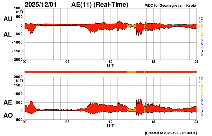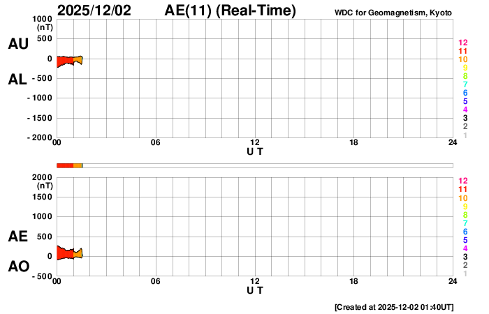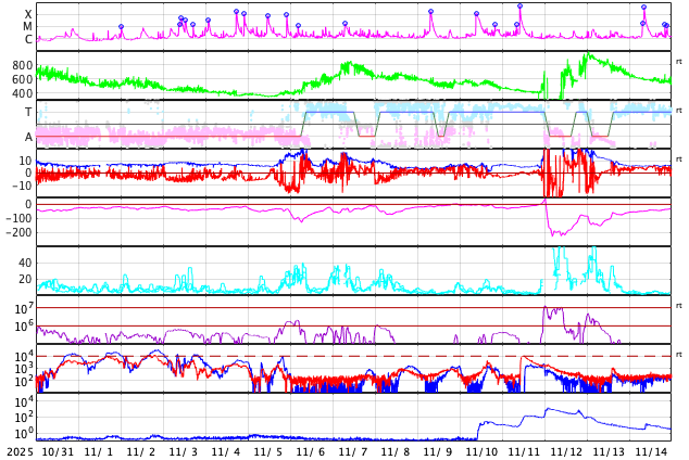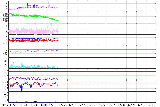 (c) GOES衛星SUVI 131 (NOAA)、(動画加工 : 宇宙天気ニュース) ![]() X1.9の大規模フレアで、コロナのガスが激しく噴出する様子。 (c) GOES衛星SUVI 304 (NOAA)、(動画加工 : 宇宙天気ニュース) ![]() CMEは太陽の左上に広がっていますが、右側にも淡く広がっている様です。 (c) SOHO衛星LASCO C2、C3 (ESA & NASA)、(動画加工 : 宇宙天気ニュース) ![]() CMEは太陽の左上に広がっていますが、右側にも淡く広がっている様です。 (c) GOES衛星CCOR-1 (NOAA)、(動画加工 : 宇宙天気ニュース) ![]() 太陽を地球よりも右斜めから観測しているSTEREO Ahead衛星COR2によるCME。 (c) STEREO Ahead衛星COR2 (NASA)、(動画加工 : 宇宙天気ニュース) ![]() NOAA/SWPCの太陽風予報では、CMEは地球に対して横向きに大きく広がっています。 (c) WSA-ENLIL太陽風予報 (NOAA)、(動画加工 : 宇宙天気ニュース) ![]() GOES衛星のSUVI 195カメラによる太陽コロナの様子 (c) NOAA/SWPC ![]() SDO衛星による太陽の可視光写真(SOHO衛星の画像ページより取得)。 マウスの矢印を写真に重ねると、黒点番号付きの写真に切り替わります。 (c) SDO (NASA) ![]() GOES衛星の太陽X線強度。赤・橙 = 0.1〜0.8 nm、青・紫 = 0.05〜0.4 nm (c) データ:NOAA/SWPC、作図:宇宙天気ニュース ![]() ACEが観測した太陽風の磁場(黒線は全体の強度、赤線は南北成分) 磁場の向き、プラズマの密度、速度、温度 (c) データ:NOAA/SWPC、作図:宇宙天気ニュース ![]() AE指数(速報値) 下段のAEグラフの値が高くなると、オーロラ活動が活発化しています。 (c) 京都大学WDC ![]() ![]() 27日の太陽周期に合わせた図 太陽が同じ面を地球に向けていた27日前の変化から、今後を予想することができます。 (c) 作図:宇宙天気ニュース