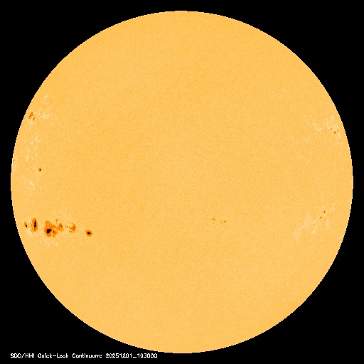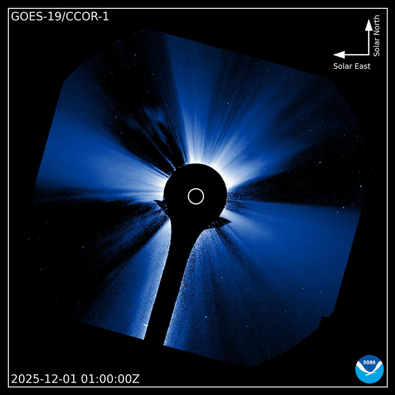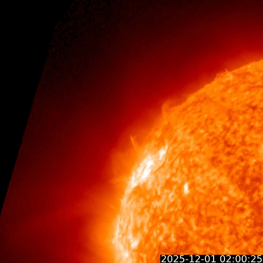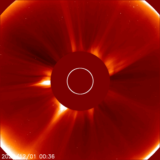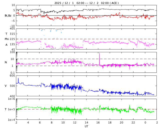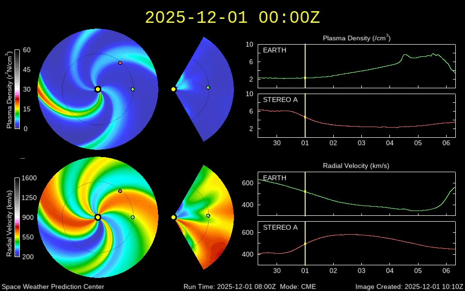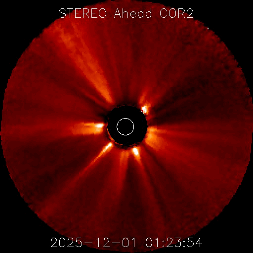 2025/12/ 2 10:50 更新 X1.9フレアのCMEが太陽の左側に広がっています。太陽風は平均的な速度に戻りました。 担当 篠原 昨日の昼、1日11時半(世界時1日2時半)に、 太陽の北東の端(左上)の4299黒点群で発生した X1.9の大規模フレアのその後の画像を含めた動画を掲載します。 1枚めはGOES衛星SUVI 131、2枚めはSUVI 304です。 131ではXフレアの強い輝きが、 304ではコロナのガスの激しい噴出がよく見えています。 CME(コロナ質量放出)の様子を、 SOHO衛星LASCO C2、C3とGOES衛星CCOR-1で紹介します。 CMEは太陽の左上に向かって激しく広がっていますが、 太陽の右側にも淡い広がりが見えている様です。 このため、太陽風の弱い乱れが地球にもやってくるかもしれません。 やって来るとすると、明日、3日の午後くらいでしょうか。 太陽風に変化が見られるかどうか注目して下さい。 また、太陽を地球よりも右斜めから観測している STEREO Ahead衛星のCOR2でも、 CMEは横向きに噴出している様に見えています。 この事も、噴出が地球寄りに広がっていることを 示しているのかもしれません。 NOAA/SWPCの太陽風予報では、 CMEは地球に対して横向きに大きく広がっています。 この広がりでは地球への影響はなさそうですが、 実際はどうなるでしょうか。 4299群は、その後は特に活動を起こしていません。 一方、南東(左下)の4294群、4296群で、 C7.9、C6.0、C4.2、C4.1などの小規模フレアが発生しています。 こちらの活動にも注目して下さい。 太陽風は、昨日のニュースの後も速度の低下が続き、 520km/秒と高速の状態から、 現在は420km/秒と平均的な速さに戻っています。 磁場強度は、5〜6nTと平均的な状態です。 11月24日に始まった高速の太陽風は、 1週間ほど続きました。 太陽風磁場の南北成分は、弱い南寄りの変化が見られます。 磁気圏の活動も強まって、 AE指数は、500nT前後の中規模の変化が続いています。 ただし、太陽風の速度が下がってきたので、 この後の磁気圏活動は、規模が小さくなるでしょう。 GOES衛星SUVI 195では、 太陽の中心部の北側にコロナホールが大きく広がっています。 明日か明後日くらいから、太陽風の速度が高まる可能性があります。