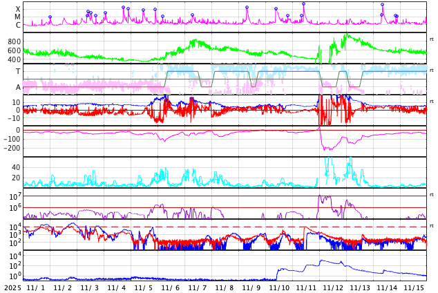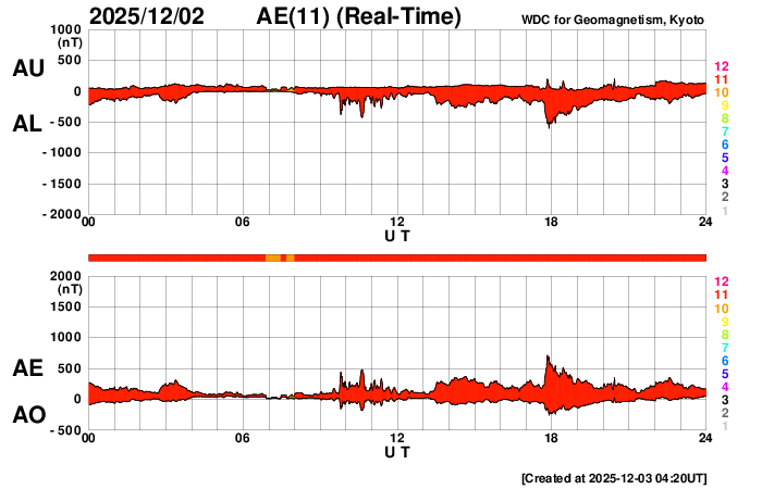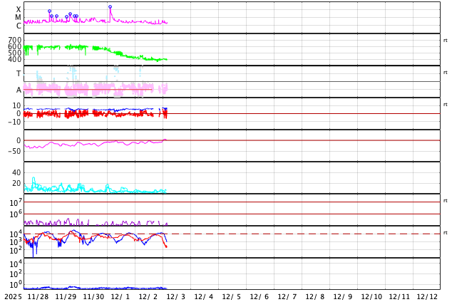 2025/12/ 3 13:20 更新 太陽風は平均的な状態です。コロナホールの影響が始まりそうです。 担当 篠原 太陽風の速度は、400km/秒前後と平均的な状態で推移しています。 磁場強度は、6nTと平均的な値です。 磁場の南北成分は、弱い南寄りの変化が発生しています。 磁気圏では小規模の変化が見られていて、 AE指数は、300nTの小規模の変化が続き、 700nTに達する中規模の変化も発生しています。 GOES衛星SUVI 195の太陽コロナ写真では、 北半球のコロナホールは、西側にだいぶ進んでいます。 これから、この領域の影響で、 太陽風の速度が高まりそうです。 太陽は、中心部南東側(左下)の4298黒点群でC4.0、 北西の端(右上)の4288群でC5.4、 北東(左上)の4299群でC4.1 などの小規模フレアが発生しています。 今の所、特に活発に活動している領域はありません。
