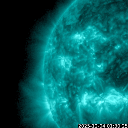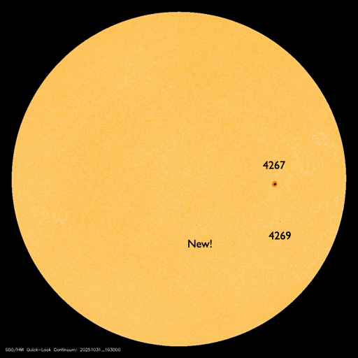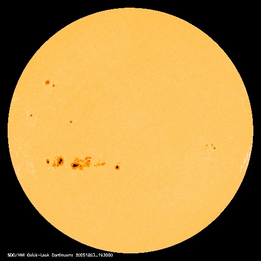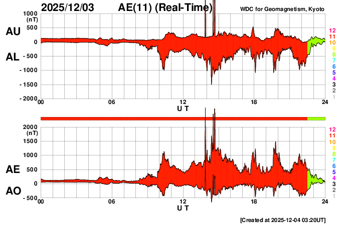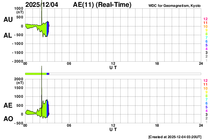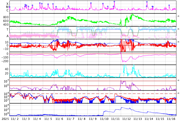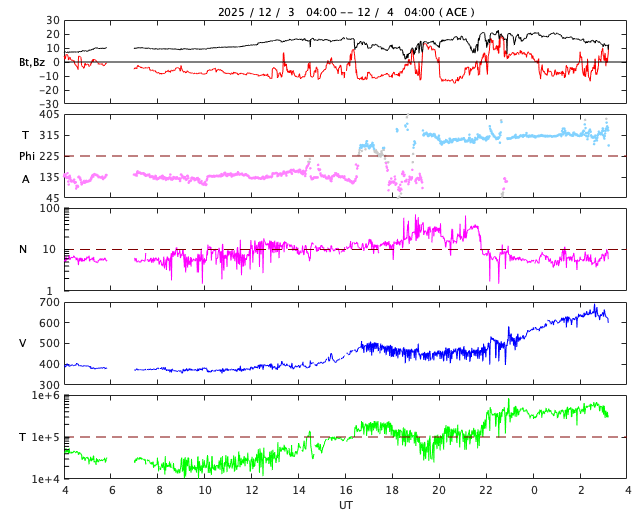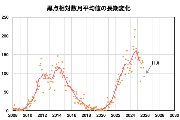 2025/12/ 4 12:23 更新 高速太陽風が到来して、速度は650km/秒に高まっています。11月の黒点相対数は 91.8 でした。 担当 篠原 WDC-SILSO より、11月の黒点相対数月平均値は、 91.8 と発表されました。 5月の 78.5 以来、第25期の極大を過ぎた後としては2回めの2桁です。 10月は 114.6 だったのですが、 グラフを見ると、11月は大きく下がったという印象です。 1日値を見ると、 X5.0の大規模フレアを起こした4274黒点群が見えていた頃の、 11月6日から15日にかけての10日間は、 最大 154 など 100以上の値が続いていたのですが、 その他はほぼ2桁でした(20日のうち18日)。 最小は、11月1日の 20 です。 黒点相対数の1日値がここまで小さくなったのは、 2022年6月8日の 3 以来、3年5か月ぶりです。 1枚めの図を見ると、第25期の初めの頃以来ということになります。 太陽風は、4日1時(世界時3日16時)頃から速度が高まり始め、 初めは400km/秒から450km/秒に少し上がった程度でしたが、 今朝、4日7時(世界時3日22時)頃からは本格的に高まり、 現在は650km/秒とかなり高速になっています。 磁場強度は、10〜20nTと強まった状態で推移しています。 GOES衛星SUVI 195の北西側(右上)に見えている コロナホールの影響が始まった様です。 27日周期の図を見ると、高まりは同じくらいに始まっています。 前回は、800km/秒まで速度は高まりました。 今回はどうなるでしょうか。 太陽風磁場の南北成分は、 南寄りで強まっていて、-10nT程度の変化が続いています。 磁気圏の活動は激しくなっていて、 AE指数は、1000〜1500nTの大きい変化が何度も発生しています。 現在は速度がかなり高まっているので、 磁気圏の活動も強まりやすい状態です。 GOES衛星SUVI 195では、 コロナホールはすでに中心線を通り過ぎています。 速度の高まりは、もう3〜4日くらいで終わるかもしれません。 太陽は、つい先ほど、4日11時半(世界時4日2時半)に、 北東(左上)の4300黒点群でM6.0の中規模フレアが発生しました。 GOES衛星SUVI 131の動画を掲載します。