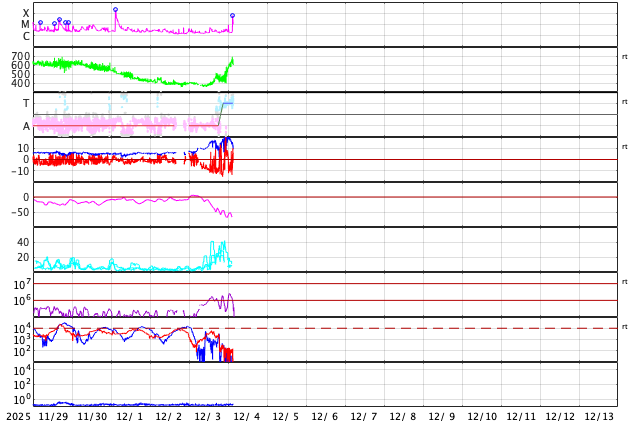 GOES衛星の太陽X線強度。赤・橙 = 0.1〜0.8 nm、青・紫 = 0.05〜0.4 nm (c) データ:NOAA/SWPC、作図:宇宙天気ニュース ![]() | |||||||||||||||||||||||||||||||||||||||||||||||||||||||||||||||||||||||||||||||||||||||||||||||||||||||||||||||||||||||||||||||||||||||||||||||||||||||||||||||||||||||||||||||||||||||||||||||||||||||||||||||||||||||||||||||||||||||||||||||||||||||||||||||||||||||||||||||||||||||||