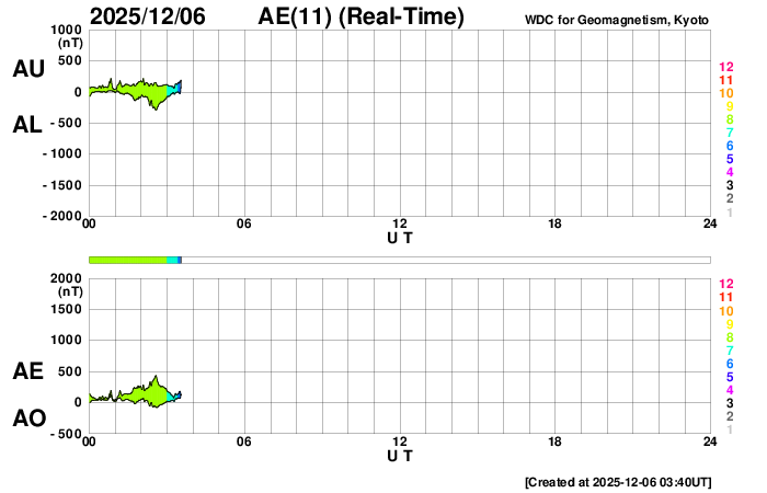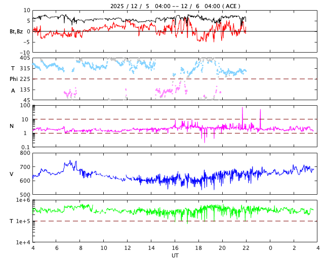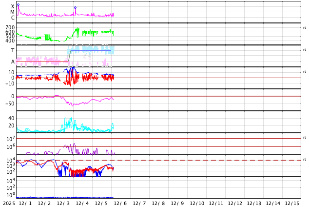 2025/12/ 6 12:52 更新 太陽風の速度は700km/秒に高まっています。磁気圏もある程度活動的です。 担当 篠原 太陽風の速度は、今日未明にかけて600km/秒となっていましたが、 そこから再び高まって、現在は700km/秒とかなり高速です。 磁場強度は、5〜7nTと平均的な状態です。 磁場の南北成分は、 南寄りになったり、北寄りになったりしています。 南寄りになった頃に磁気圏の活動が強まって、 AE指数は、500nT前後の中規模の変化が発生しています。 GOES衛星SUVI 195を見ると、 コロナホールは、西の端(右端)に進んで、 広がりが見にくくなっています。 太陽風速度の高まりはどこまで続くでしょうか。 太陽は、中心部南側の4294、4296黒点群で、 C4.3、C3.8、C5.2、C6.4など、 小規模フレアが頻繁に発生しています。 活動の規模が大きくなる様であれば、注目して下さい。 ![]() GOES衛星のSUVI 195カメラによる太陽コロナの様子 (c) NOAA/SWPC ![]() SDO衛星による太陽の可視光写真(SOHO衛星の画像ページより取得)。 マウスの矢印を写真に重ねると、黒点番号付きの写真に切り替わります。 (c) SDO (NASA) ![]() ACEが観測した太陽風の磁場(黒線は全体の強度、赤線は南北成分) 磁場の向き、プラズマの密度、速度、温度 (c) データ:NOAA/SWPC、作図:宇宙天気ニュース ![]() AE指数(速報値) 下段のAEグラフの値が高くなると、オーロラ活動が活発化しています。 (c) 京都大学WDC ![]() ![]() 27日の太陽周期に合わせた図 太陽が同じ面を地球に向けていた27日前の変化から、今後を予想することができます。 (c) 作図:宇宙天気ニュース