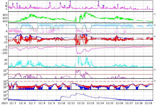 GOES衛星の太陽X線強度。赤・橙 = 0.1〜0.8 nm、青・紫 = 0.05〜0.4 nm (c) データ:NOAA/SWPC、作図:宇宙天気ニュース ![]() | ||||||||||||||||||||||||||||||||||||||||||||||||||||||||||||||||||||||||||||||||||||||||||||||||||||||||||||||||||||||||||||||||||||||||||||||||||||||||||||||||||||||||||||||||||||||||||||||||||||||||||||||||||||||||||||||||||||||||||||||||||||||||||||||||||||