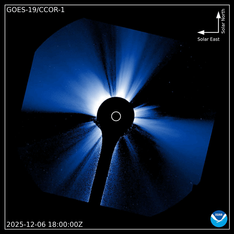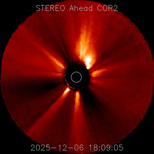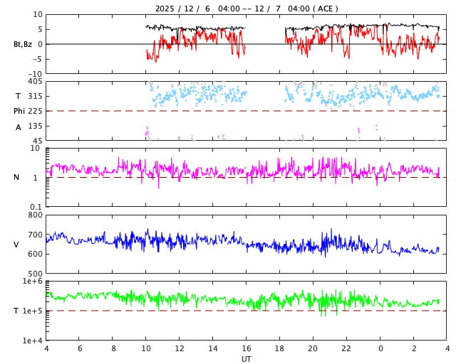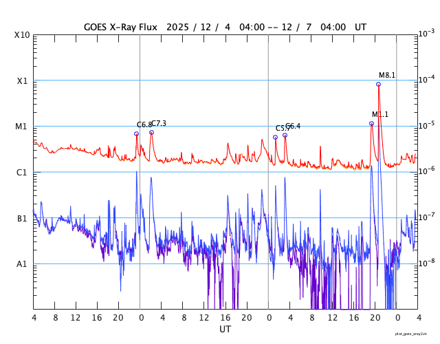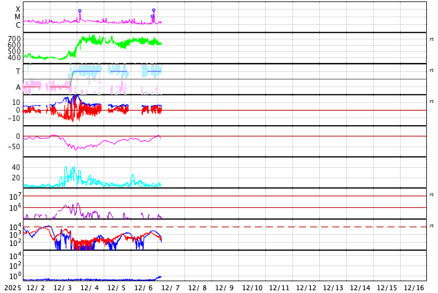 2025/12/ 7 12:47 更新 太陽風は600km/秒と高速の状態が続いています。M8.1の中規模フレアが発生しました。 担当 篠原 太陽風の速度は、700km/秒から600km/秒へゆっくり下がっていますが、 高まった状態が続いています。 磁場強度は、5〜6nTと平均的な状態です。 太陽風磁場の南北成分は、グラフの中盤以降は、 0nT付近か、北寄りになっています。 磁気圏の活動は穏やかになっていて、 AE指数は、初めの頃は500nTくらいの変化が起きていますが、 その後は変化がなくなり、穏やかな状態です。 GOES衛星SUVI 195の太陽コロナ写真では、 西の端(右端)に達したコロナホールは、 現在はほとんど見えなくなっています。 太陽風速度の高まりは、この後はどの様に推移するでしょうか。 太陽は、中心部北側の4299黒点群で、 今朝、7日4時(世界時6日19時)にM1.1、 7日5時半(世界時6日20時半)にM8.1の中規模フレアが発生しました。 GOES衛星SUVI 131の動画を掲載します。 4299群は穏やかな状態で推移していたので、 急な活動の発生に見えました。 この後はどうなるでしょうか。 このフレアに伴って、CME(コロナ質量放出)が発生しています。 GOES衛星CCOR-1を見ると、 コロナのガスは淡いですが、太陽を丸く囲む様に広がっています。 また、太陽を地球よりも右斜めから観測している STEREO Ahead衛星COR2では、 CMEは地球のある左側に噴出しています。 このため、太陽風の乱れは地球にやって来そうです。 到来まで2〜3日くらいかかると考えると、 9日か10日頃でしょうか。 NOAA/SWPCの太陽風予報などの情報に注目して下さい。 太陽風の乱れが到来して、太陽風の磁場が南向きに強まると、 オーロラなどの磁気圏の活動が活発になります。 今回のCMEはあまり激しい噴出ではない様に感じます。 それでも磁場が強まると活動は激しくなる可能性があるので注目して下さい。