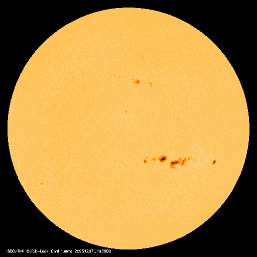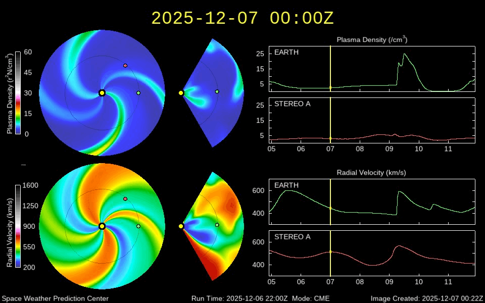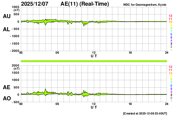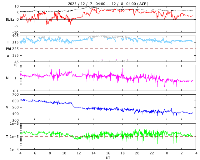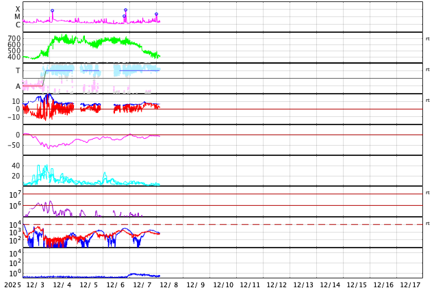 2025/12/ 8 12:43 更新 太陽風は、400km/秒と平均的な速度に戻っています。 担当 篠原 太陽風の速度は、昨日のニュース以降は低下が続き、 600km/秒と高速の状態から、 現在は400km/秒と平均的な速さに戻っています。 磁場強度は、6nTから7nTへ少し上がっています。 磁場の南北成分は、北寄りになっています。 磁気圏は穏やかになっていて、 AE指数は、グラフの後半は変化が見られなくなっています。 GOES衛星SUVI 195では、 北東の端(左上)にコロナホールが微かに見えている程度です。 CME(コロナ質量放出)の影響を除くと、 太陽風は穏やかに推移しそうです。 昨日、7日の朝に4299黒点群で発生した、 M1.1とM8.1の中規模フレアの時に発生した CMEによる太陽風の乱れについて、 NOAA/SWPCの予報が公開されています。 これによると、太陽風の乱れは、 明日の午後、9日15時(世界時9日6時)頃に 地球に到来する可能性があるとのことです。 この場合、フレアの発生から2日半ほどかかることになり、 速度の高まりは、普通の高速風くらいになりそうです 磁場が大きく強まって、南向きに変化すると磁気圏の活動は活発になります。 どの様な乱れが到来するか、注目して下さい。 太陽は、中心部北側の4299群でM2.4、 南西(右下)の4294群でM2.0の中規模フレアが発生しています。 4294群は、左の4296群とともに、 Cクラスの小規模フレアを頻繁に起こしています。 フレアの規模が大きくなる様であれば、注目して下さい。