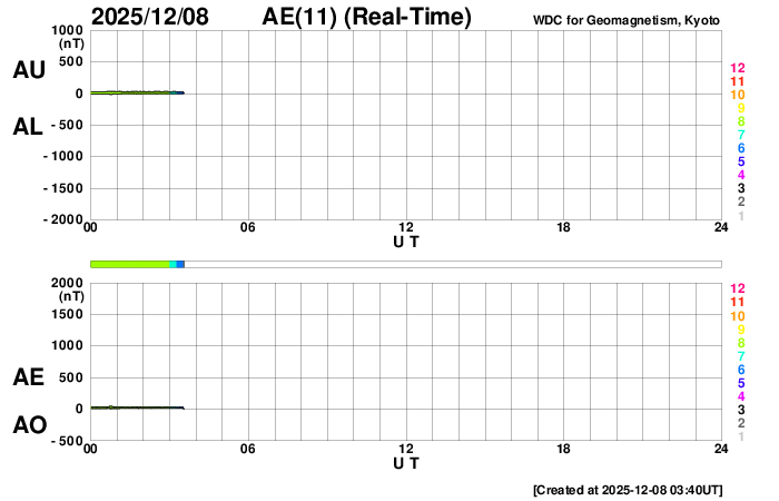 (c) WSA-ENLIL太陽風予報 (NOAA)、(動画加工 : 宇宙天気ニュース) ![]() GOES衛星のSUVI 195カメラによる太陽コロナの様子 (c) NOAA/SWPC ![]() SDO衛星による太陽の可視光写真(SOHO衛星の画像ページより取得)。 マウスの矢印を写真に重ねると、黒点番号付きの写真に切り替わります。 (c) SDO (NASA) ![]() ACEが観測した太陽風の磁場(黒線は全体の強度、赤線は南北成分) 磁場の向き、プラズマの密度、速度、温度 (c) データ:NOAA/SWPC、作図:宇宙天気ニュース ![]() AE指数(速報値) 下段のAEグラフの値が高くなると、オーロラ活動が活発化しています。 (c) 京都大学WDC ![]() ![]() 27日の太陽周期に合わせた図 太陽が同じ面を地球に向けていた27日前の変化から、今後を予想することができます。 (c) 作図:宇宙天気ニュース