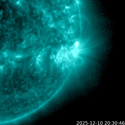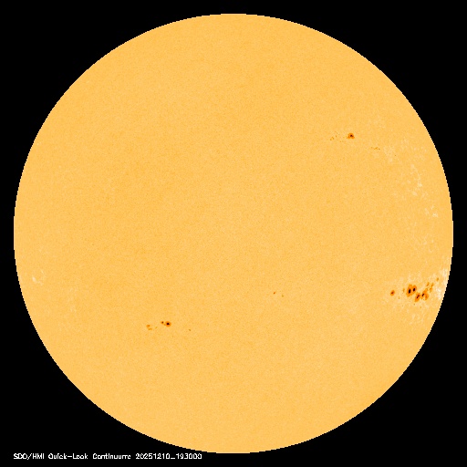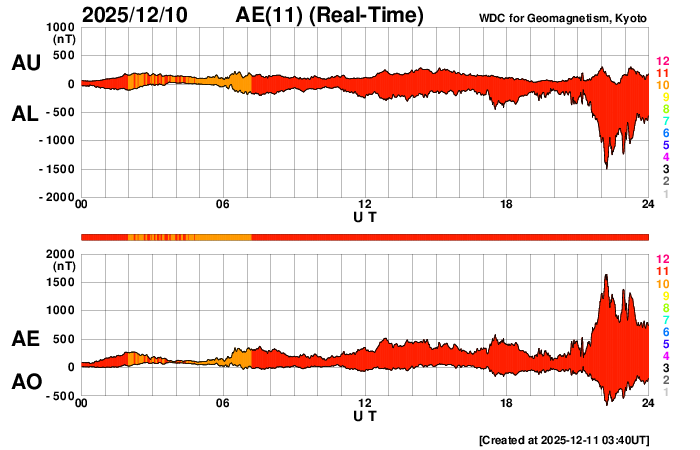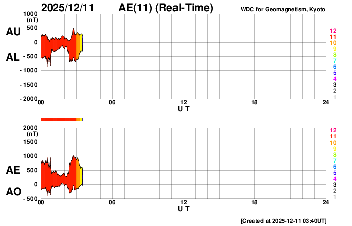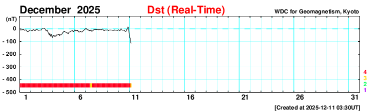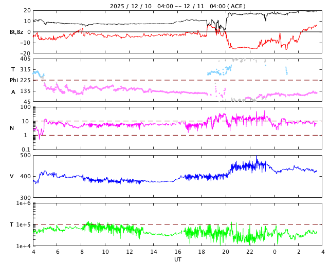 2025/12/11 12:44 更新 太陽風磁場の強まりが到来し、南向きに変化して磁気圏の活動が強まっています。 担当 篠原 太陽風の磁場強度は、 昨日のニュースの後に7nTに少し下がり、 この状態が続いていましたが、 今日未明から変化が見られ始め、 11日5時(世界時10日20時)に、17nTへ達する急な強まりが発生しました。 速度は、400km/秒から、450km/秒へ少し高まっています。 この時に、磁場の南北成分が大きく南向きに変化して、 -15nTの状態が3時間ほど続いて、 その後は値が次第に小さくなって、 グラフの最後で0nT付近に戻っています。 この影響で磁気圏の活動が強まり、 AE指数は1000〜1500nTと大きい変化がしばらく続き、 Dst指数は、-114nTまで強まっています。 現在の太陽風は、磁場強度は20nTに強まっていますが、 南北成分が北向きに切り替わっている様で、 このまま北向きが続くと、磁気圏の活動は規模が小さくなるでしょう。 速度は、430km/秒と平均的な状態です。 GOES衛星SUVI131では、 北半球のコロナホールが、太陽の西側(右側)に進んでいます。 明後日くらいから影響が始まる可能性があります。 太陽は、南西の端(左下)に近づいた4294黒点群で、 M1.2、M1.9、M1.0、M1.6、M4.4と中規模フレアが続いています。 最後のM4.4の動画を掲載します。 CME(コロナ質量放出)は、M4.4の時に弱い噴出が見える程度です。 4294群は、この後、太陽の向こう側に進んでいきます。 太陽の中心部から東側にかけては、活動的な領域は特にないので、 太陽は穏やかになりそうです。 ![]() Dst指数の速報値は、-114nTに達しています。 (c) 京都大学WDC ![]() 4294黒点群で発生した、M4.4の中規模フレア。 (c) GOES衛星SUVI 131 (NOAA)、(動画加工 : 宇宙天気ニュース) ![]() GOES衛星のSUVI 195カメラによる太陽コロナの様子 (c) NOAA/SWPC ![]() SDO衛星による太陽の可視光写真(SOHO衛星の画像ページより取得)。 マウスの矢印を写真に重ねると、黒点番号付きの写真に切り替わります。 (c) SDO (NASA) ![]() ACEが観測した太陽風の磁場(黒線は全体の強度、赤線は南北成分) 磁場の向き、プラズマの密度、速度、温度 (c) データ:NOAA/SWPC、作図:宇宙天気ニュース ![]() AE指数(速報値) 下段のAEグラフの値が高くなると、オーロラ活動が活発化しています。 (c) 京都大学WDC ![]() ![]() 27日の太陽周期に合わせた図 太陽が同じ面を地球に向けていた27日前の変化から、今後を予想することができます。 (c) 作図:宇宙天気ニュース