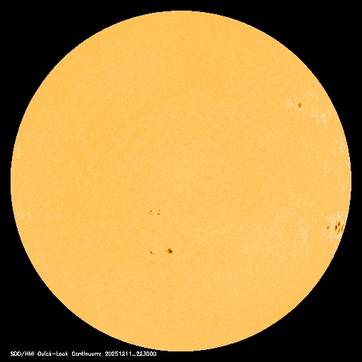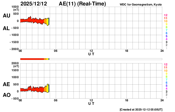 2025/12/12 14:18 更新 太陽風磁場の強まりは下がって来ました。速さは平均的な状態です。 担当 篠原 太陽風の速度は、410km/秒から450km/秒に少し上がっています。 速さとしては平均的な状態です。 磁場強度は、昨夜までは20nTに強まっていましたが、 今朝にかけて10nTに下がり、現在もこの値です。 値は下がりましたが、強まった状態は続いています。 磁場の南北成分は、グラフの前半は北向きでしたが、 後半から南向きになって、-10nT近い強まりになっています。 磁気圏の活動は限定的で、 AE指数は、グラフの後半に1300nTの大きい変化が起きていますが、 その前後は小さい変化に留まっています。 GOES衛星SUVI 195では、 北半球のコロナホールは西側(右側)に進み、 明日くらいから影響が始まるかもしれません。 広がりは高緯度側に伸びて、東側(左側)で再び低緯度側に下がっています。 この間、太陽風の速度はどのように変化するでしょうか。 太陽は、南西の端(右下)に達した4294黒点群で、 C9.7と大きい小規模フレアが発生しています。 また、隣の4296群で、 ちょうど今、M2.0の中規模フレアが発生しました。 X線グラフの最後の高まりです。 これらの領域が太陽の向こう側に進むと、 太陽は穏やかになりそうです。
