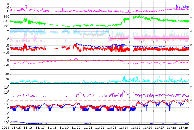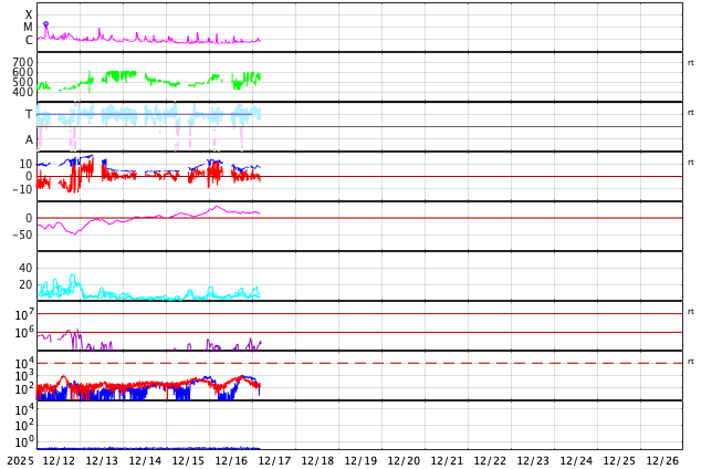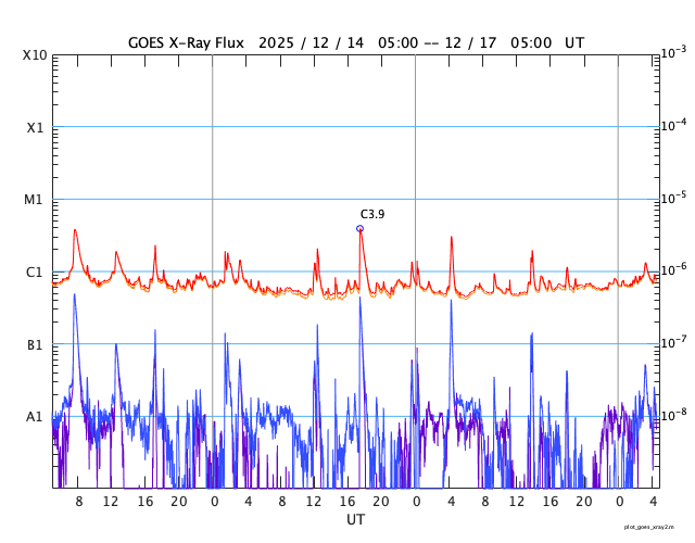 GOES衛星の太陽X線強度。赤・橙 = 0.1〜0.8 nm、青・紫 = 0.05〜0.4 nm (c) データ:NOAA/SWPC、作図:宇宙天気ニュース ![]() | |||||||||||||||||||||||||||||||||||||||||||||||||||||||||||||||||||||||||||||||||||||||||||||||||||||||||||||||||||||||||||||||||||||||||||||||||||||||||||||||||||||||||||||||||||||||||||||||||||||||||||||||||||||||||||||||||||||||||||