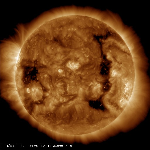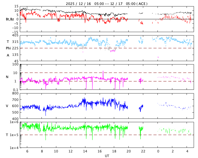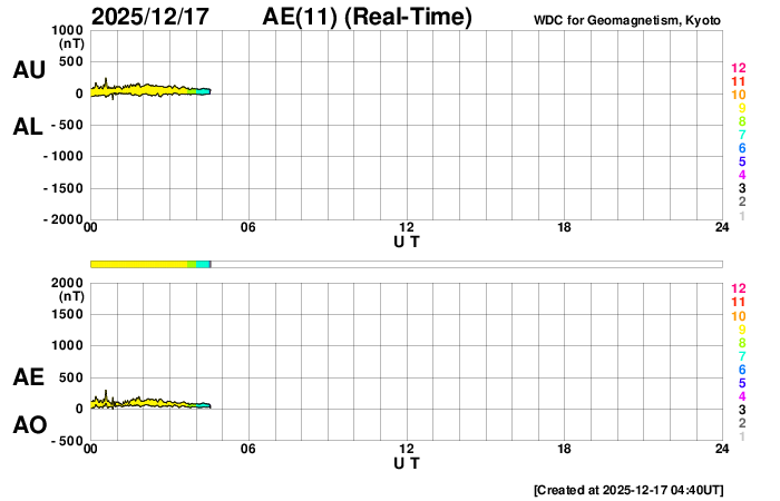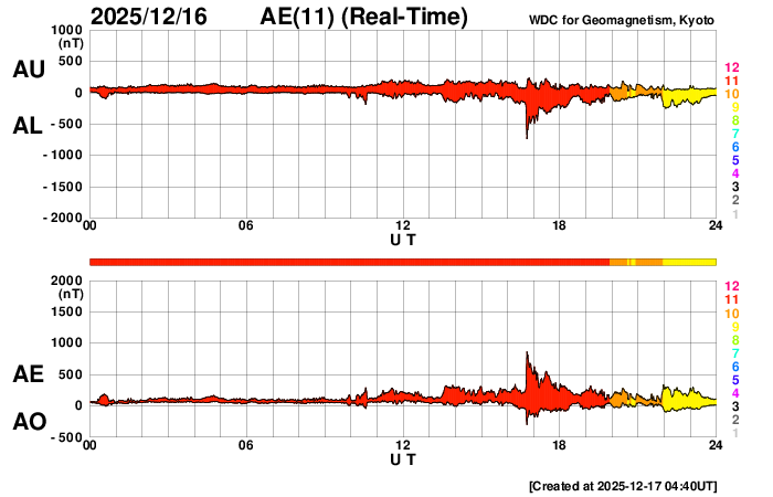 2025/12/17 13:51 更新 太陽風の速度は650km/秒まで高まり、高速の状態が続いています。北極航路の機内からのオーロラをどうぞ。 担当 篠原 アイスランドへオーロラ観測に向かう途中の 飛行機の中から撮影されたオーロラの写真を、 藤井哲也さんからいただきました。 アラスカから北極を越えてスカンジナビア半島に向かう航路で、 藤井さんより「オーロラファンにとってはうれしいコースです」とのことです。 1枚目は、アラスカを越えて北極点に達する少し前と、 かなり高緯度での撮影です。 現地は昼に近い時間帯で(極夜で暗い状態です)、 オーロラが現れやすい緯度は夜の時間帯よりも高くなっています。 ここで撮影できたのはこのことも関係しているのかもしれません。 2枚目はスカンジナビア半島に近づいての撮影とのことで、 現地はほぼ真夜中でした。 オーロラ観望には最適の場所と時間帯だったと言えそうです。 ただし、AE指数を見るとこの日のオーロラの活動はとても弱く、 オーロラの輝きとしては控えめだった様です。 藤井さんは、これからアイスランドで観測されるとのことです。 その最初の撮影情報をどうもありがとうございます。 昨日、500km/秒に高まっていた太陽風の速度は、 その後も上昇が続いて、昨夜遅くに650km/秒に達し、 その状態がしばらく続いて、 現在は少し下がっていますが、570km/秒と高速の状態が続いています。 SDO衛星AIA193の太陽コロナ写真を見ると、 (SDO衛星の画像を掲載するのは3か月ぶりです) 南北に細長く伸びるコロナホールは、西側(右側)にだいぶ進んでいます。 この領域の影響がやってきているのでしょうか。 太陽風の磁場強度は、12nTから7nT程度へ下がっています。 南北成分は、グラフの前半は北寄りでしたが、 後半は0nT付近で小さく変化する様になっています。 磁気圏の活動もこれに対応して、 AE指数は、グラフの前半は変化がありませんが、 途中から小規模の変化が続く様になっています。 速度が高まっていることもあり、 この後もある程度の活動が見られそうです。 SDO衛星AIA193では。東端(左端)に次のコロナホールが現れています。 5〜6日後くらいから、この領域の影響が始まりそうです。 太陽は、穏やかな状態です。 北東の端(左上)の少し向こう側で、 C1.5、C1.9、C1.1と小さいフレアが発生しています。 活発というほどではありませんが、 この後、黒点群が現れそうです。 9月15日からWebサーバーの故障のため停止していた SDO衛星のデータページがある程度回復した様で、 3か月ぶりに太陽コロナや可視光の写真を掲載しています。 停止している間は、 宇宙天気ニュースの中で手作業で対応していた部分があったので、 復活はとても助かります。 完全に復活することを期待しています。