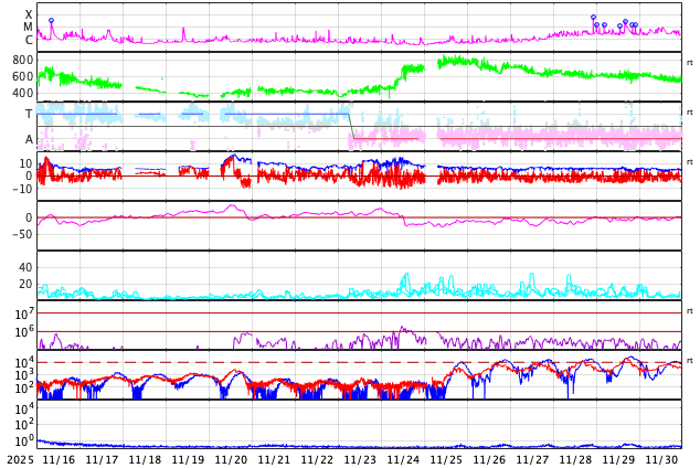 GOES衛星の太陽X線強度。赤・橙 = 0.1〜0.8 nm、青・紫 = 0.05〜0.4 nm (c) データ:NOAA/SWPC、作図:宇宙天気ニュース ![]() | |||||||||||||||||||||||||||||||||||||||||||||||||||||||||||||||||||||||||||||||||||||||||||||||||||||||||||||||||||||||||||||||||||||||||||||||||||||||||||||||||||||||||||||||||||||||||||||||||||||||||||||||||||||||||||||||||