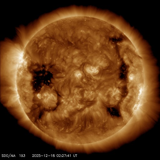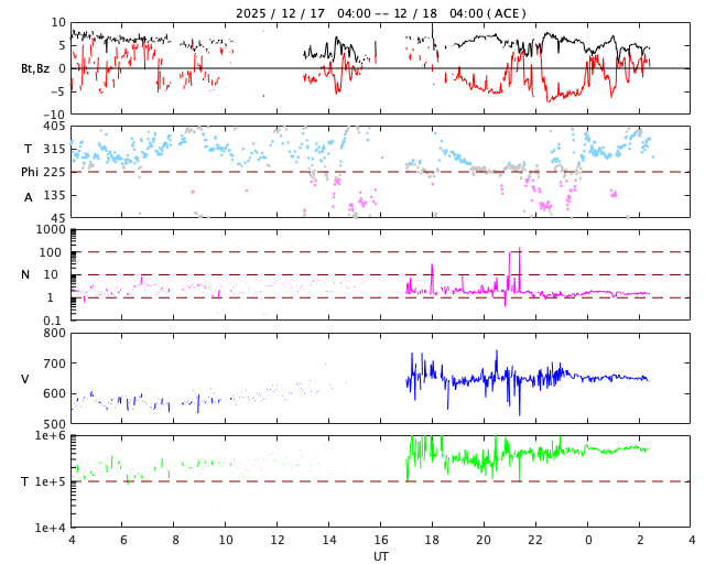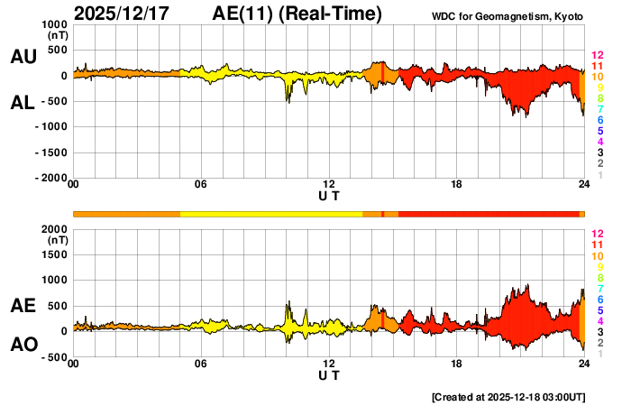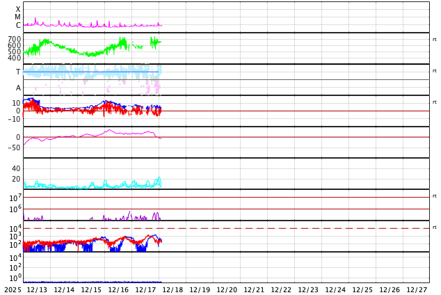 2025/12/18 12:13 更新 太陽風は650km/秒と高速です。アイスランドのオーロラをどうぞ。 担当 篠原 アイスランドに滞在中の藤井哲也さんと高家幹夫さんより、 現地17日未明に撮影されたオーロラの写真をいただきました。 撮影場所は、アイスランド北部にあるミーバトン湖とのことです。 撮影の頃は、太陽風の速度は600km/秒と高まっていたのですが、 磁場の南向きの変化が少なく、AE指数はほとんど変化のない穏やかな状況でした。 藤井さんによると、 オーロラは強くなったり弱くなったりを繰り返していたとのことで、 強い活動にはなっていなかった様です。 1枚目の写真は、魚眼レンズによる全天の写真です。 東側から昇ったオーロラと西側から昇ったオーロラが、 やがてこの写真の様に、きれいに一つに繋がったとのことです。 緑色の光から赤色の光へ上がっていく様子がとてもきれいです。 左上の低空にオリオン座が見えています。 さすが高緯度地域です。 その後、つながったオーロラが動き始めて、太くなり(2枚目)、 強くなったり弱くなったりを繰り返していたそうです(3枚目)。 現地は快晴で、気温はマイナス13度まで下がっていたそうです。 きれいなオーロラの姿をありがとうございます。 太陽風の速度は、600km/秒から650km/秒へ再び高まっています。 SDO衛星AIA195を見ると、南北に縦に伸びるコロナホールは、 西側(右側)にだいぶ進んでいて、この領域の影響がやって来ているようです。 太陽風の磁場強度は、5nT前後と平均的な状態です。 磁場の南北成分は、南北に変化していて、 -5nT程度の南向きの変化も発生しています。 このため、磁気圏の活動は強まっていて、 AE指数は、途中から500nT程度の変化が発生するようになり、 後半では800nTと中規模の変化に達しています。 今回の太陽風速度の高まりに関係していると思われる 太陽の西側のコロナホールは、 縦に伸びていて横方向の広がりは小さいです。 このため、太陽風の高速の状態はあまり長く続かない様に思います。 この後の速度の変化に注目してください。 また、東側(左側)に次のコロナホールが見えています。 5日後くらいから、この領域の影響が始まりそうです。 太陽のX線強度のグラフは、変化が少なくなっています。 太陽は穏やかな状態です。 可視光写真では、北東の端(左上)に新しい黒点群が現れていますが、 特に活動は起こしていません。