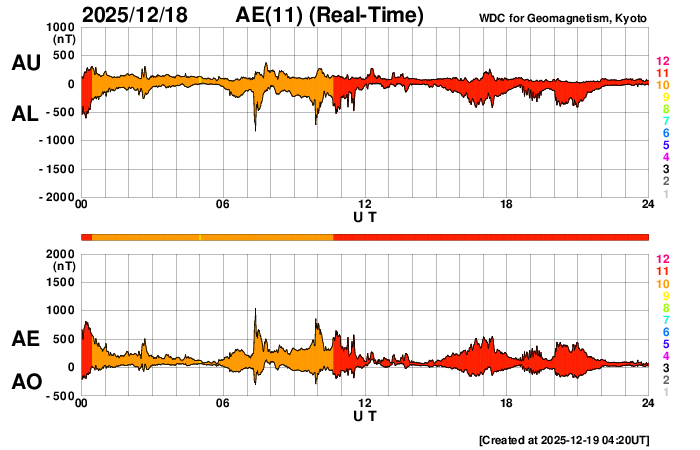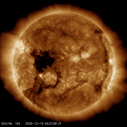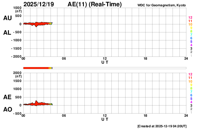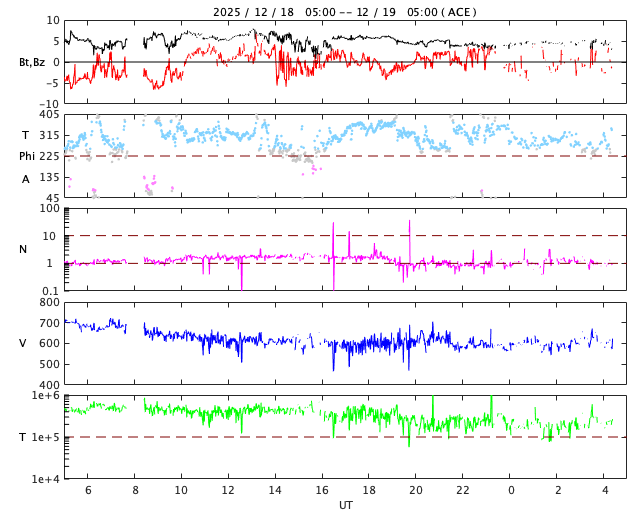 2025/12/19 13:37 更新 太陽風は600km/秒と高速の状態が続いています。 担当 篠原 太陽風の速度は、昨日の昼に、 短い時間ですが700km/秒へ高まっています。 その後、600km/秒に下がりましたが、 高速の状態が続いています。 太陽風の磁場強度は、5nT前後と平均的な値で推移しています。 南北成分は0nTを挟んで南北に変化しています。 磁気圏では、活動が強まったり、穏やかになったりしていて、 AE指数は、500nT程度の中規模の変化が度々発生しています。 SDO衛星AIA193では、 西側(右側)の縦に伸びるコロナホールは、 太陽の端に近づいています。 この後、影響は下がっていきそうです。 一方、東側(左側)から南に伸びる次のコロナホールが見えています。 4日後の23日くらいからこの領域の影響が始まりそうです。 ただし、27日周期の図を見ると、 前周期の太陽風は11月24日から速度が高まっていて、 このタイミングで変化が帰ってくると、 明後日、21日くらいになるかもしれません。 今回はいつから速度の高まりが始まるでしょうか。 太陽は、北東の端近く(左上)の4312黒点軍で C3.2の小規模フレアが発生しています。 特に活動が強まっている様子はなく、 その後は穏やかな状態です。 黒点が少なくなって、可視光写真はかなり寂しくなっています。
