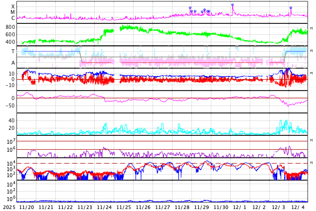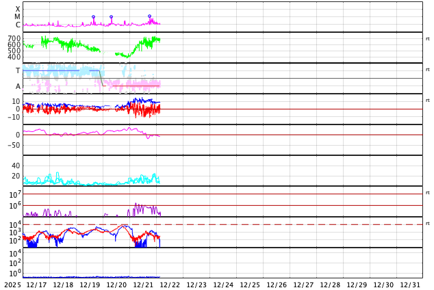GOES衛星の太陽X線強度。赤・橙 = 0.1〜0.8 nm、青・紫 = 0.05〜0.4 nm (c) データ:NOAA/SWPC、作図:宇宙天気ニュース ![]() | ||||||||||||||||||||||||||||||||||||||||||||||||||||||||||||||||||||||||||||||||||||||||||||||||||||||||||||||||||||||||||||||||||||||||||||||||||||||||||||||||||||||||||||||||||||||||||||||||||||||||||||||||||||||||||||||||||||||||||||||||||||||||||||