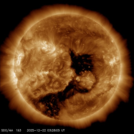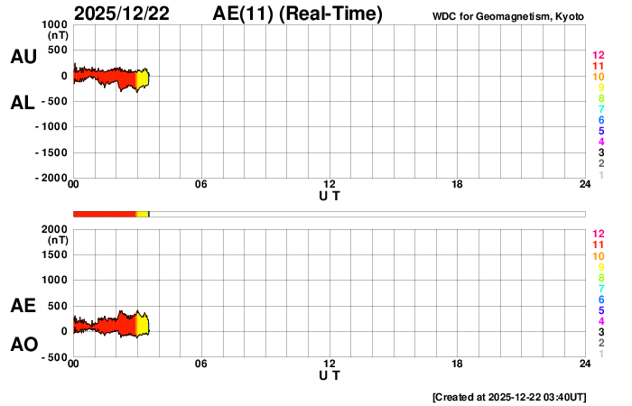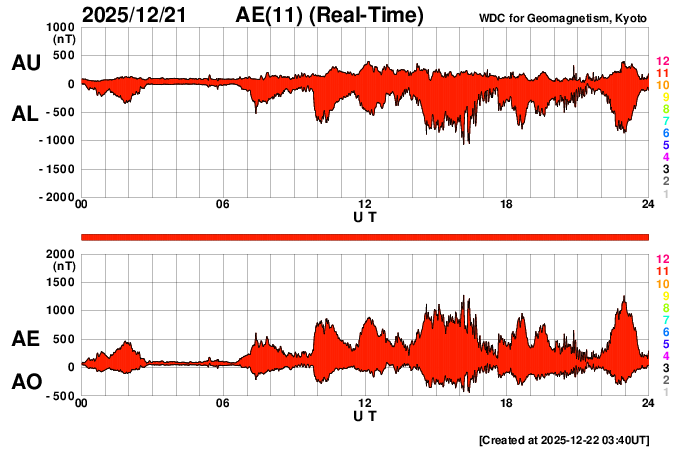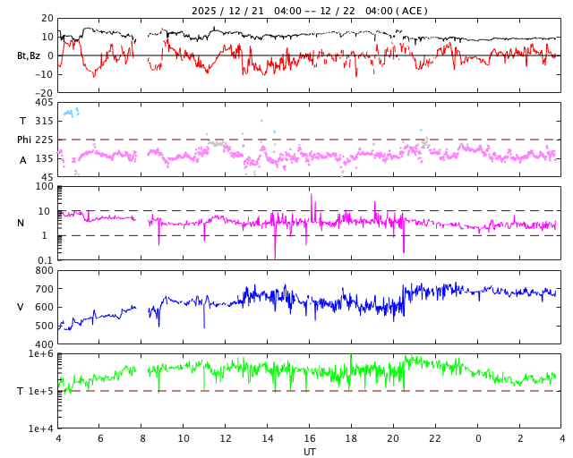 2025/12/22 12:55 更新 太陽風の速度は680km/秒に高まっています。アイスランドのオーロラをどうぞ。 担当 篠原 アイスランドに滞在中の藤井哲也さんより、 現地21日未明と朝の時間に撮影されたオーロラの写真をいただきました。 撮影場所は、ミーヴァトン湖畔から80kmほど移動した場所とのことで、 真っ黒な溶岩や火山を真っ白な雪が覆っているそうです。 1枚目は、この直前まで曇っていて、 やっと星空が見えて撮影できたとのことです。 AE指数を見ると、この少し前に500nTの変化が起きていたのですが、 この撮影の頃には変化が小さくなっています。 写真のオーロラが穏やかなのは、 変化が落ち着いたタイミングだったためかもしれません。 2枚目は時間としてはすっかり朝になっています。 快晴で満天の星空だったそうです オーロラは北の空に低く見えていたとのことです。 この頃から、太陽風の速度が高まって、オーロラの活動が強まって来ました。 次の夜からは状況が大きく変わるかもしれません。 現地の貴重な情報をどうもありがとうございます。 太陽風は、昨日のニュースの後から速度が高まっていき、 400km/秒と平均的な状態から、夕方には600km/秒に高まりました。 今朝になるともう一段高まって、現在は680km/秒で推移しています。 磁場強度は、グラフの前半は12nTに強まっていますが、 後半で少し下がり、現在は8nT程度です。 磁場の南北成分は、南北にある程度の振幅で変化を繰り返しています。 磁気圏の活動は強まって、 AE指数は、800〜1200nTと大きい変化が繰り返し発生しています。 グラフの最後は変化が少し下がっていて、 300nT程度の小規模になっています。 SDO衛星AIA193では、中心部のコロナホールは西側に進んでいますが、 速度の高まりのタイミングは少し早かった印象で、 27日周期の図の前周期の太陽風と同じ様な変化になっています。 コロナホールは、南東側(左下)に大きく広がっています。 前周期と同様に、高速風は長い期間続きそうです。 注目して下さい。 太陽は、南東の4316黒点群で、 M1.3の中規模フレアが発生し、 その後もC3.9、C6.3、C4.0、C6.2などの小規模フレアが続いています。 この後も活動が見られるでしょうか。